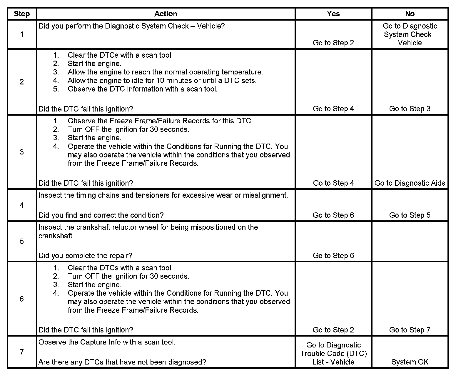 The engine control module (ECM) tests for a misalignment between both camshafts on one bank of the engine and the crankshaft. The misalignment would be at an idler sprocket for bank 1 or at the crankshaft. Once the ECM learns the position of both camshafts on one bank of the engine, the ECM compares the learned values to a reference value. If the ECM detects both learned values for one bank of the engine is exceeding a calibrated threshold in the same direction, this DTC sets.
