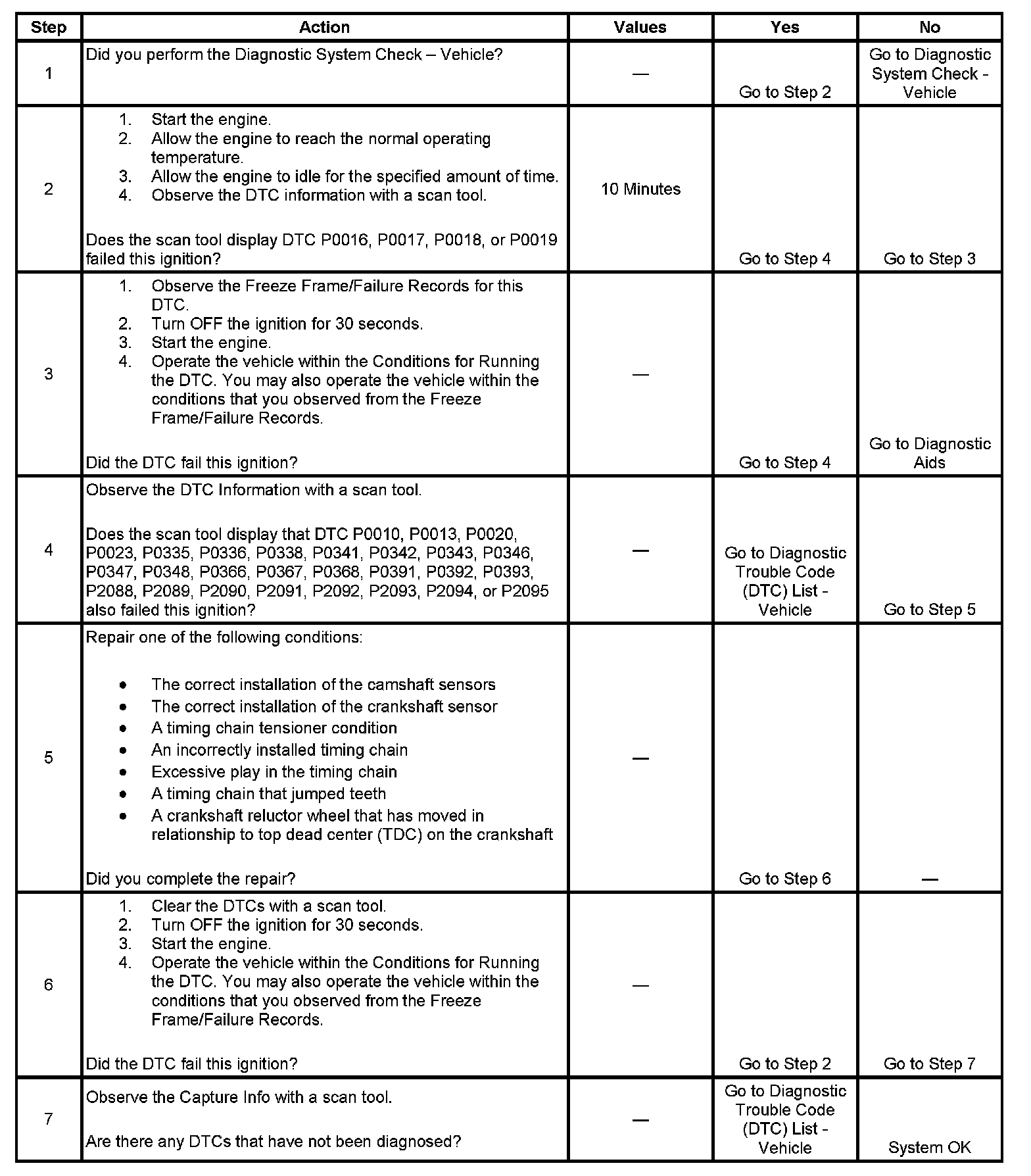 - Before the ECM can report DTC P0016, P0017, P0018, or P0019 failed, DTCs P0010, P0011, P0013, P0014, P0020, P0021, P0023, P0024, P0335, P0336, P0338, P0341, P0342, P0343, P0346, P0347, P0348, P0366, P0367, P0368, P0391, P0392, P0393, P2088, P2089, P2090, P2091, P2092, P2093, P2094, and P2095 must run and pass.