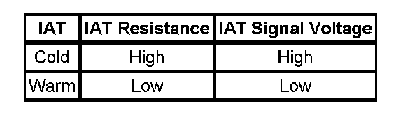 The intake air temperature (IAT) sensor is an integral part of the mass air flow (MAF) sensor. The IAT sensor is a variable resistor that measures the temperature of the intake air. The engine control module (ECM) supplies 5 volts to the IAT signal circuit and supplies a ground to the low reference circuit. If the ECM detects a high IAT signal voltage, which is a low temperature indication, this DTC sets.
