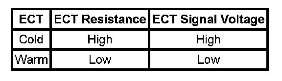 - Use the Temperature vs Resistance table in order to test the ECT sensor at various temperature levels in order to evaluate the possibility of a skewed sensor. A skewed sensor could result in a driveability condition. If the engine has sat overnight, the engine coolant temperature and the intake air temperature values should display within a few degrees. If the temperatures are not within 3°C (5°F), refer to Temperature Versus Resistance - Engine Coolant Temperature Sensor.