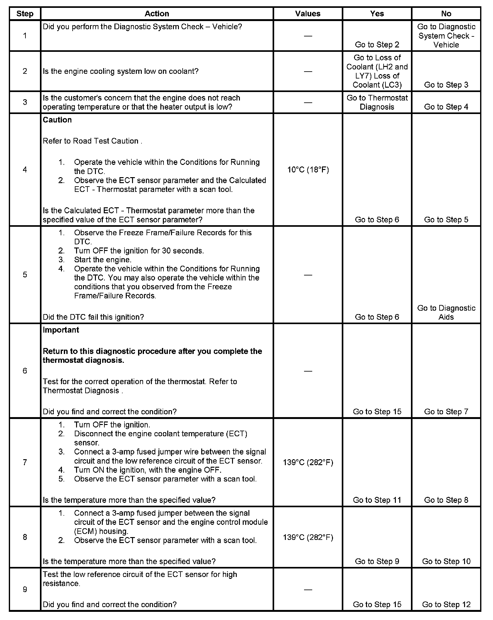 The engine control module (ECM) monitors the temperature of the engine coolant for engine control and as an enabling criteria for some diagnostics. The amount of air flow into an engine is proportional to the amount of heat an engine generates. The ECM monitors the amount of air flow into the engine to calculate engine coolant temperature (ECT). The ECM uses the calculated temperature to determine if the engine has warmed up to the thermostat regulating temperature. If the coolant temperature does not increase normally or does not reach regulating temperature of the thermostat, diagnostics that use the ECT as enabling criteria, may not run when expected. If the engine coolant temperature fails to reach the thermostat regulating temperature, before a predetermined amount of air flow enters the engine, this DTC sets.
