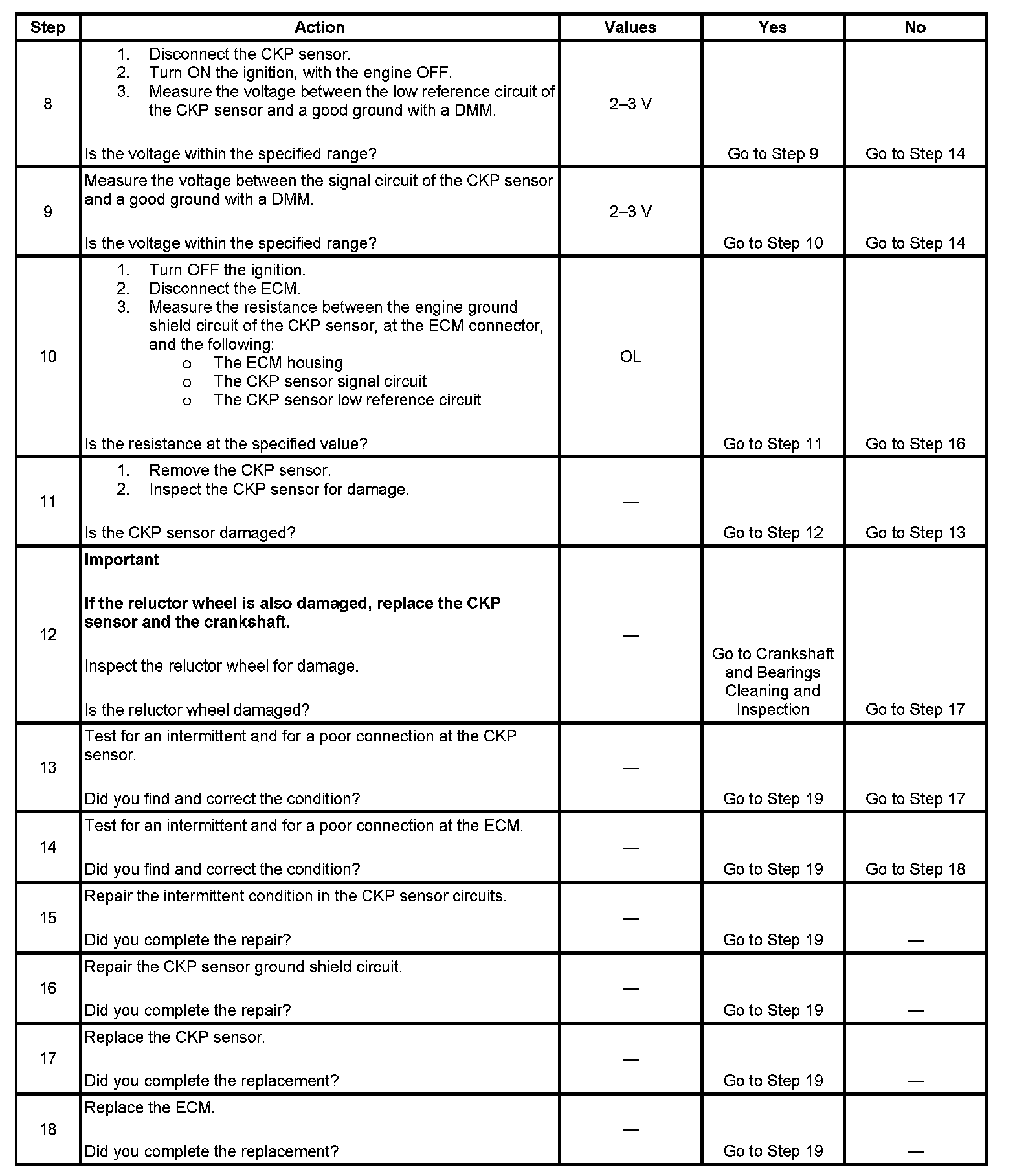 8. This step is testing for an ECM condition. The ECM uses a pull-up voltage of 2.5 volts on each CKP sensor circuit to reduce noise interference from EMI. If the voltage is not present, replace the ECM.