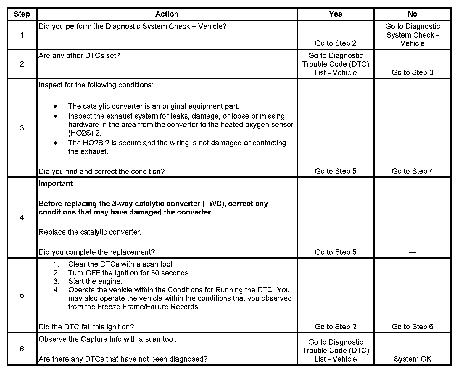 In order to maintain a reasonably low emission level of hydrocarbons (HC), carbon monoxide (CO), and oxides of nitrogen (NOx) a 3- way catalytic converter (TWC) is used. The catalyst within the converter promotes a chemical reaction that oxidizes the HC and CO present in the exhaust gas. This reaction converts the gases into harmless water vapor and carbon dioxide. The catalyst also reduces the NOx, converting the NOx into nitrogen. The engine control module (ECM) monitors this process using the post catalyst heated oxygen sensor (HO2S) signal. The post-catalyst HO2S located in the exhaust stream after the TWC, produces an output signal that indicates the oxygen storage capacity of the catalyst. The oxygen storage capacity (OSC) determines the ability of the catalyst to convert the exhaust emissions effectively. If the catalyst is functioning correctly, the post-catalyst HO2S signal will be far less active than the signal produced by the pre-catalyst HO2S.