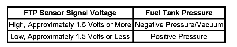 The control module tests the evaporative emission (EVAP) system for a large leak. The control module monitors the fuel tank pressure (FTP) sensor signal to determine the EVAP system vacuum level. When the conditions for running are met, the control module commands the EVAP canister purge valve OPEN and the EVAP vent valve CLOSED. This allows engine vacuum to enter the EVAP system. At a calibrated time, or vacuum level, the control module commands the EVAP canister purge valve closed, sealing the system, and monitors the FTP sensor input in order to determine the EVAP system vacuum level. If the system is unable to achieve the calibrated vacuum level, or the vacuum level increases too slowly, this DTC sets.