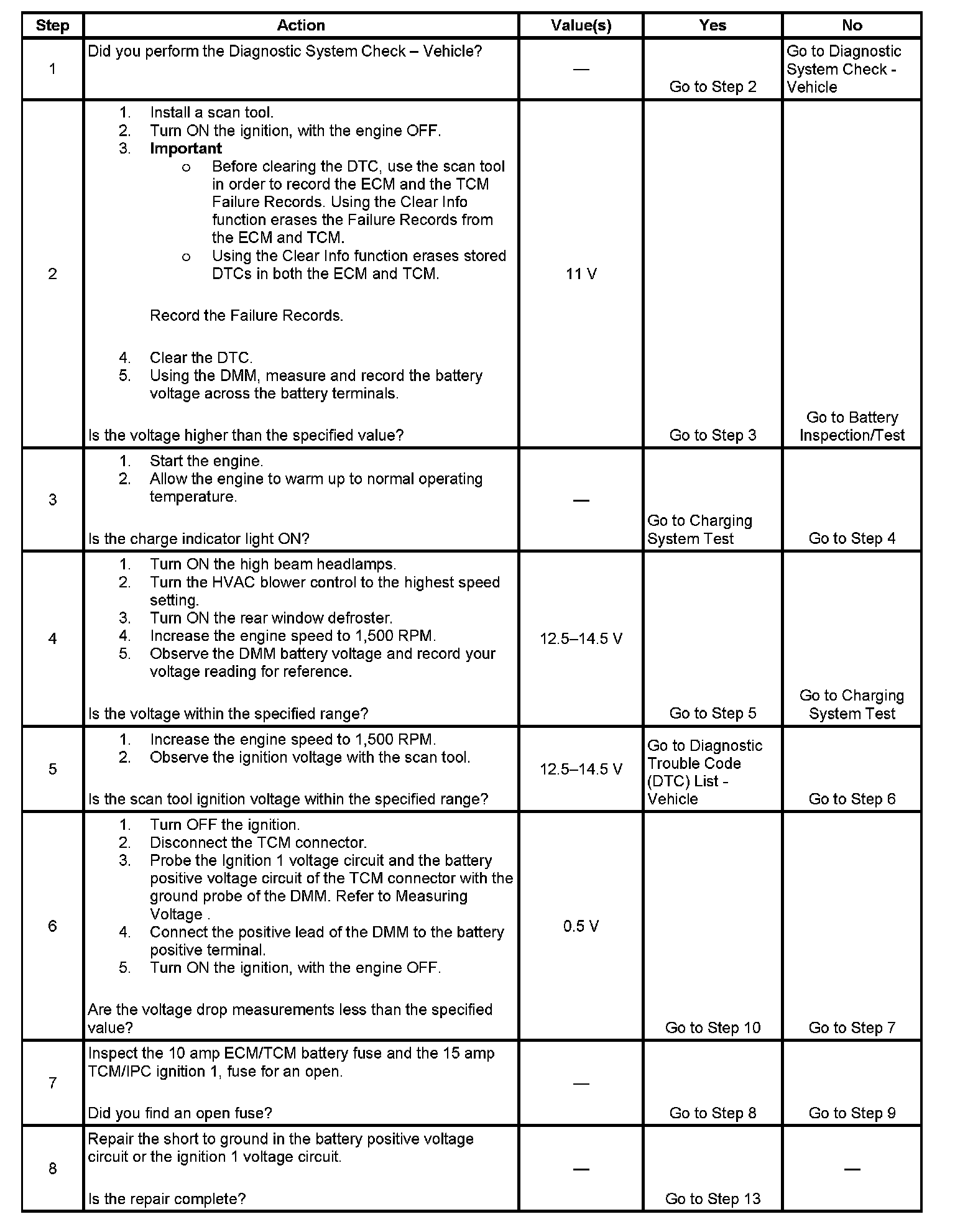 The transmission control module (TCM) continuously monitors the system voltage on the Ignition 1 and the battery circuits. Lower than normal voltage may be inadequate to operate the transmission control solenoids properly. Improper solenoid operation may cause erratic transmission operation and tie-up conditions, which may result in internal damage.