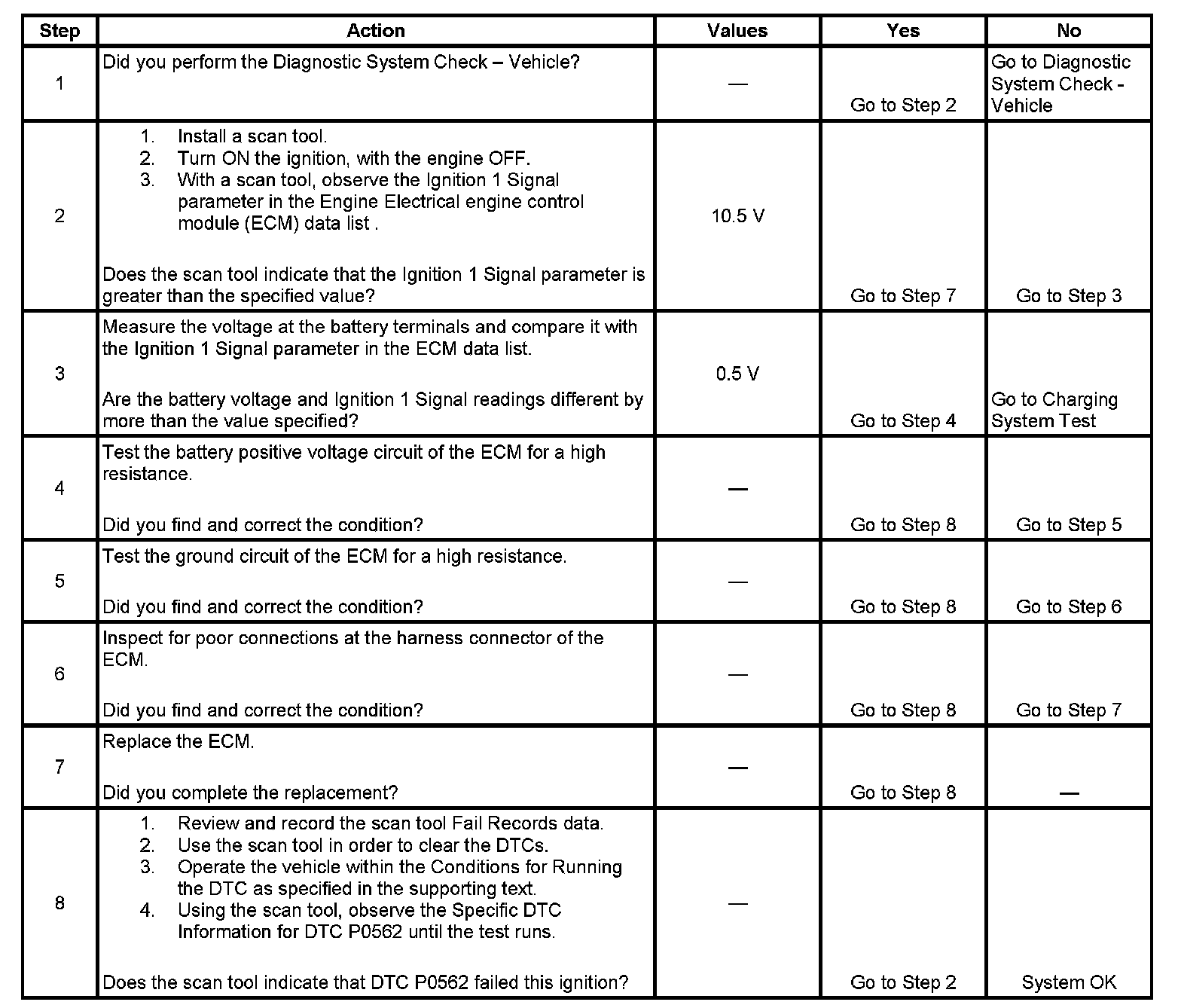 The engine control module (ECM) monitors the system voltage to ensure that the voltage stays within the proper range. Damage to components, and incorrect input can occur when the voltage is out of range. The ECM monitors the system voltage over an extended length of time. If the ECM detects an excessively low system voltage, DTC P0562 will set.
