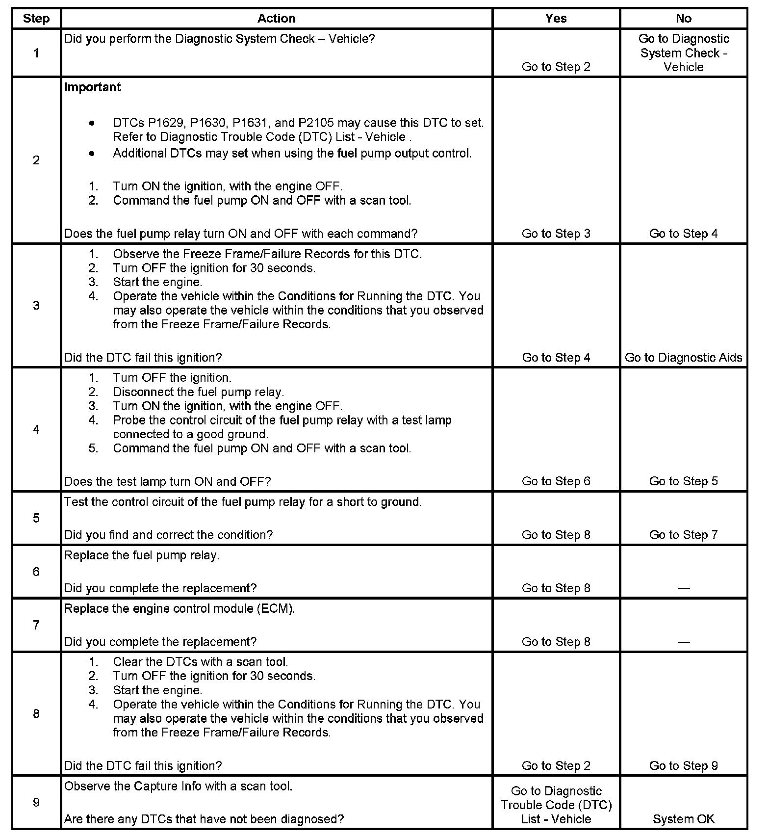 The fuel pump relay control circuit is equipped with a feedback circuit that is pulled up to 2.5 volts within the ECM. The ECM can determine if the control circuit is open, shorted to ground, or shorted to a voltage by monitoring the feedback voltage. If the ECM detects the control circuit voltage is less than a predetermined voltage when commanded ON, this DTC sets.