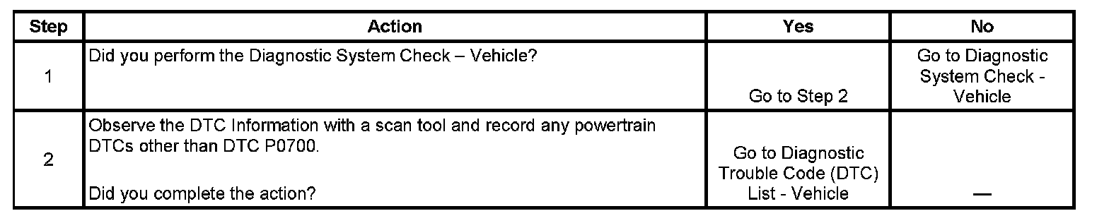 This diagnostic trouble code (DTC) indicates that an emission related transmission DTC set in the transmission control module (TCM). The engine control module (ECM) receives the TCM information over the serial data circuit. The ECM turns ON the malfunction indicator lamp (MIL) when the TCM sends a message over the serial data circuit requesting MIL illumination. The DTC information for the ECM will only display DTC P0700.