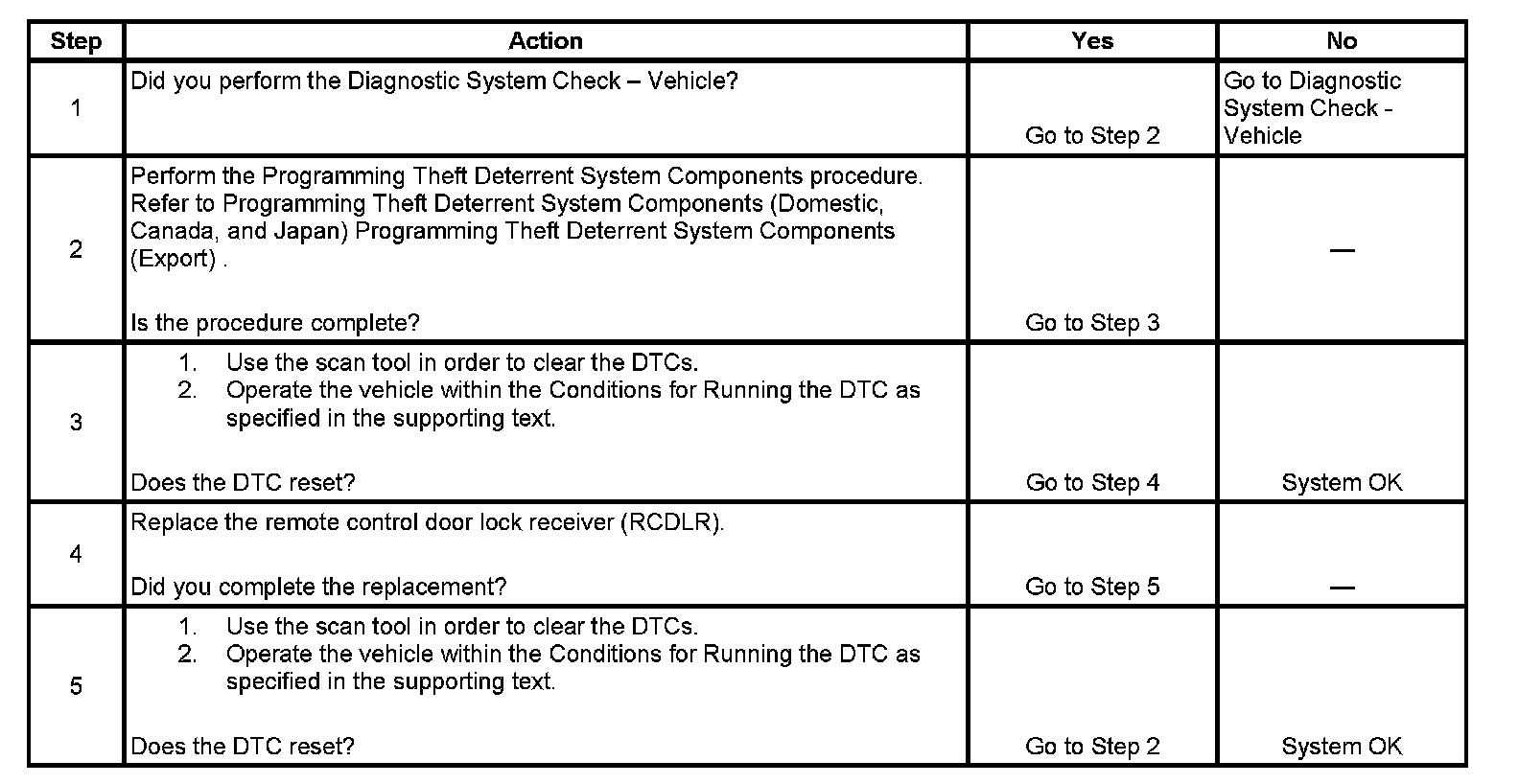 5. If the ECM resets the DTC after the programming theft deterrent system components procedure has been performed, the RCDLR is malfunctioning.