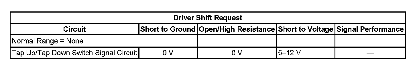 With the engine ON, engage the Tap Up and Tap Down switch positions while observing the Driver Shift Request scan tool parameter. The parameter should change to reflect the selected Up or Downshift switch position and with no Up or Downshift switch position selected the parameter should display None.