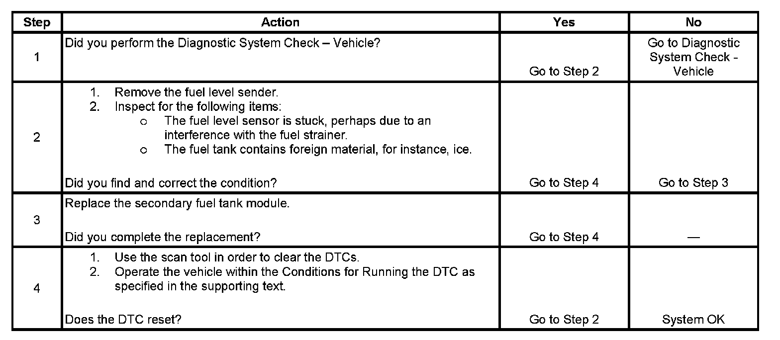 This diagnostic tests for the secondary fuel level sensor signal movement. The ECM sets this DTC when it detects a difference between engine consumed fuel and change of the fuel level signal of the secondary fuel level sensor.