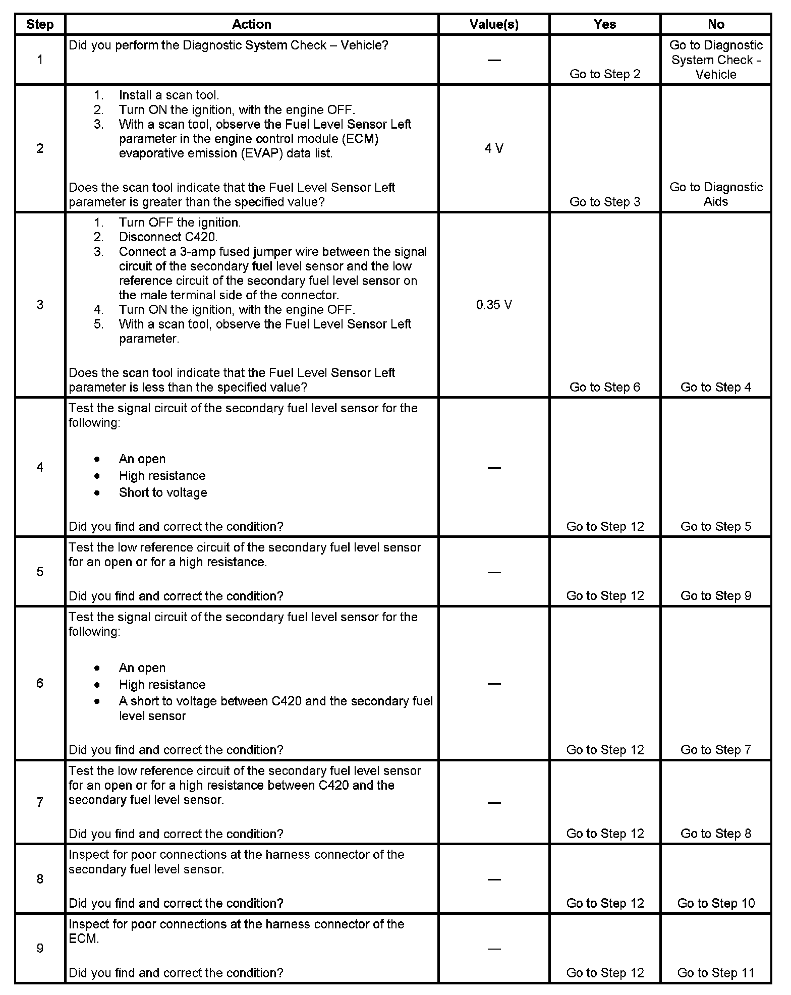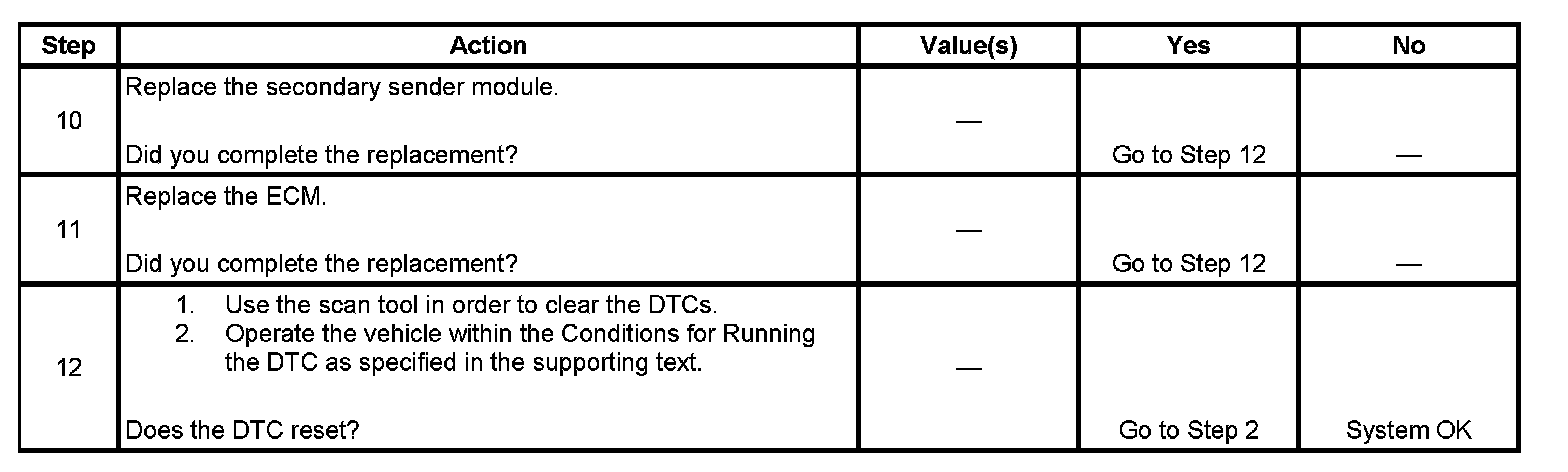 The primary fuel level sender and the secondary fuel level sender change resistance in response to fuel level. The engine control module (ECM) monitors the signal circuit of the primary fuel level sender and the signal circuit of the secondary fuel level sender in order to determine the fuel level. When the fuel tanks are full, the resistances of both fuel level senders are high, and the ECM senses a high signal voltage on both the signal circuit of the primary fuel level sender and the signal circuit of the secondary fuel level sender. When the fuel tanks are empty, the resistances of the fuel level senders are low, and the ECM senses a low signal voltage. The ECM uses the signal circuits of the primary fuel level sender and the secondary fuel level sender in order to calculate the percentage of remaining fuel in the tanks. The ECM sends the fuel level percentage via the GMLAN serial data circuit to the instrument cluster in order to control the fuel gage. The fuel level information is also used for misfire and evaporative emission (EVAP) diagnostics. This diagnostic tests for a higher than normal secondary fuel level sender signal.