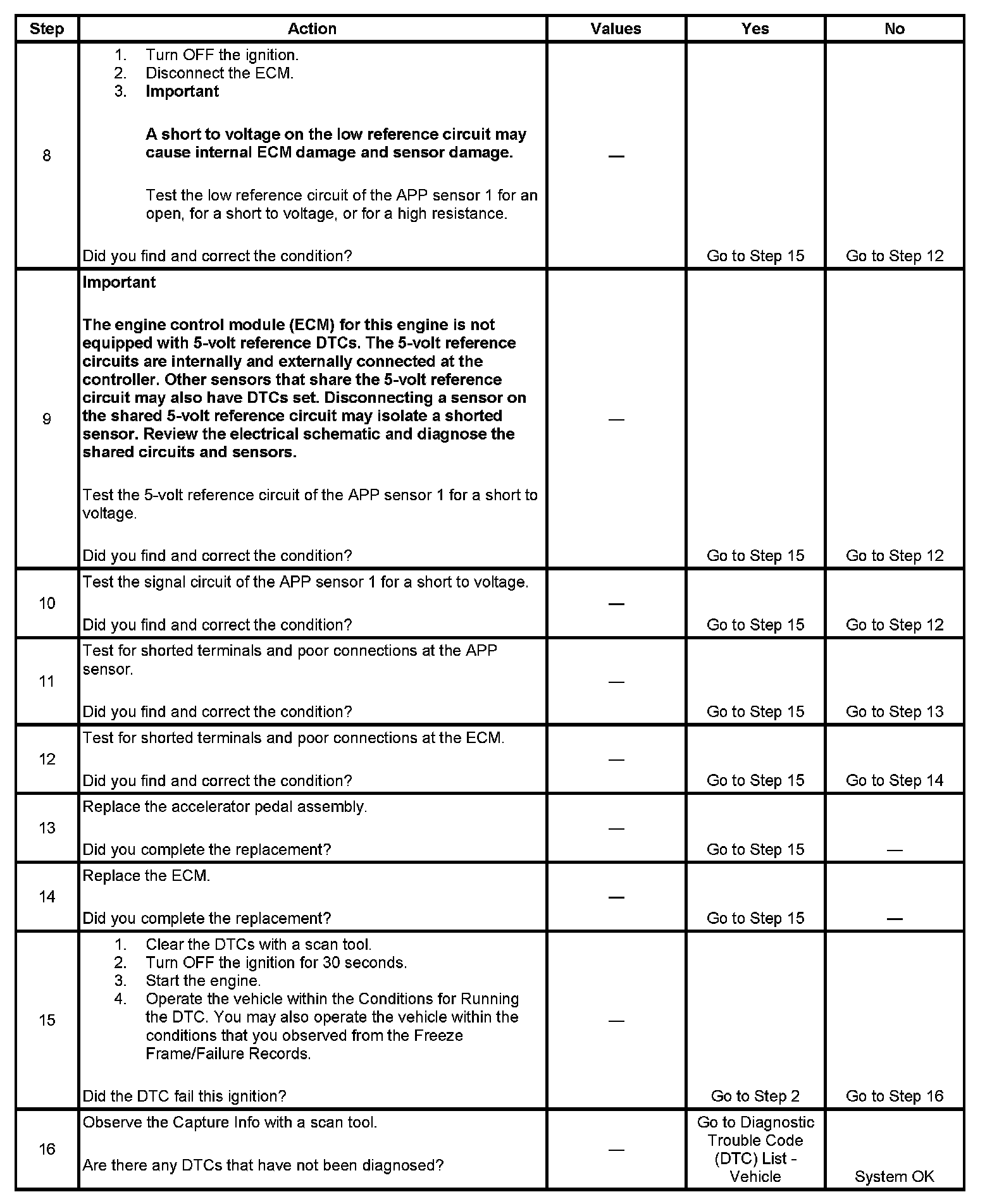 3. This step tests the internal circuits of the APP sensor 1 throughout its range of motion. If this DTC sets when slowly moving the pedal from the rest position to wide open throttle (WOT), replace the APP assembly for an internal fault.