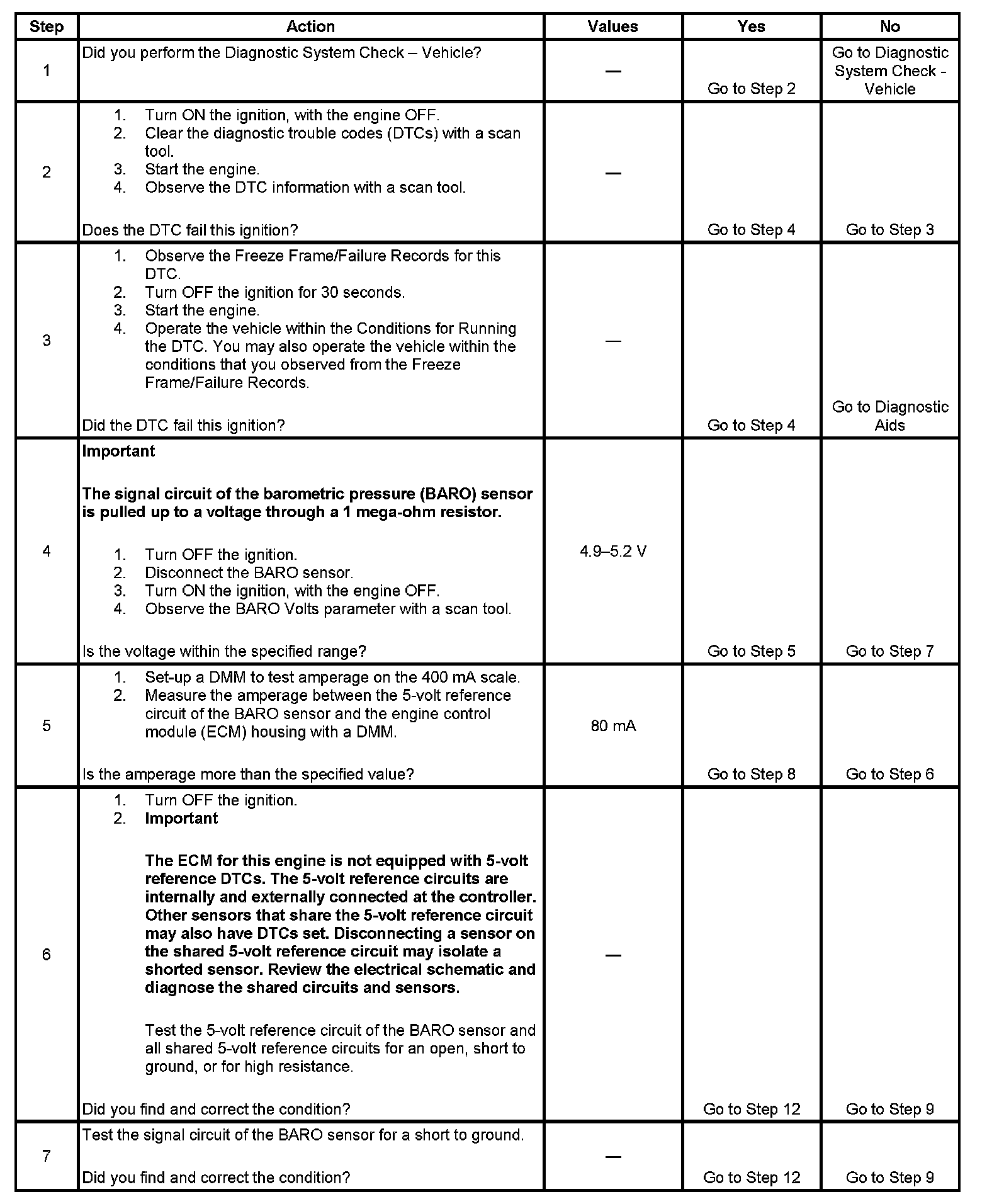 5. The ECM produces a measurable steady-state amperage that provides the 5-Volt reference to the BARO sensor. If the amperage on the 5-Volt reference circuit is less than the specified value, test the 5-Volt reference circuit for an open, a high resistance, or for a short to ground.