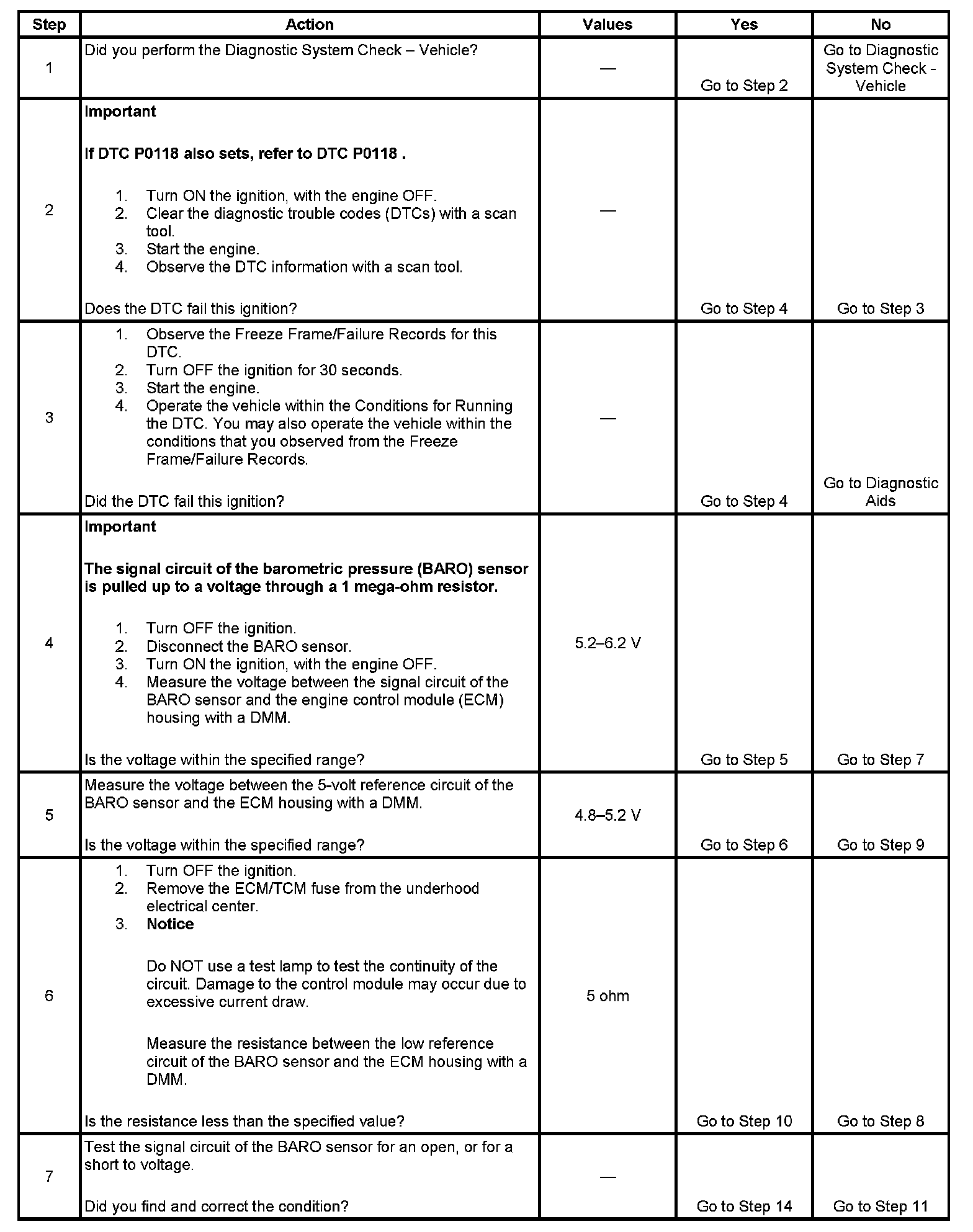 The numbers below refer to the step numbers on the diagnostic table.