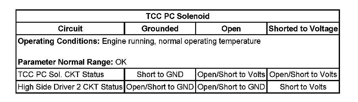 3. Observe the scan tool data parameter TCC PC Sol. CKT Status, the parameter should display OK.