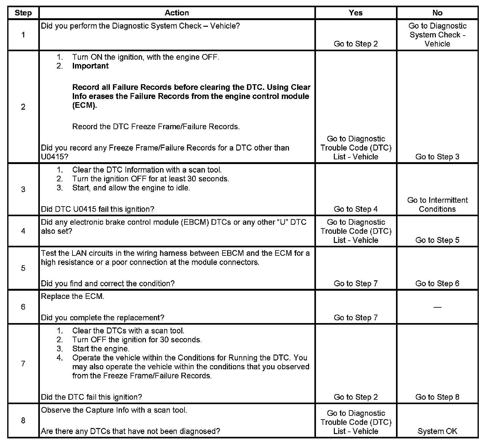 The electronic brake control module (EBCM) sends antilock brake system (ABS) data to the engine control module (ECM). The data is sent to the ECM through a communication network called the GM local area network (LAN). Two circuits are used to communicate LAN data between the ECM and EBCM. A fault in the LAN will not cause DTC U0415 to set by itself. If a LAN fault occurs, other DTCs will set in addition to DTC U0415.