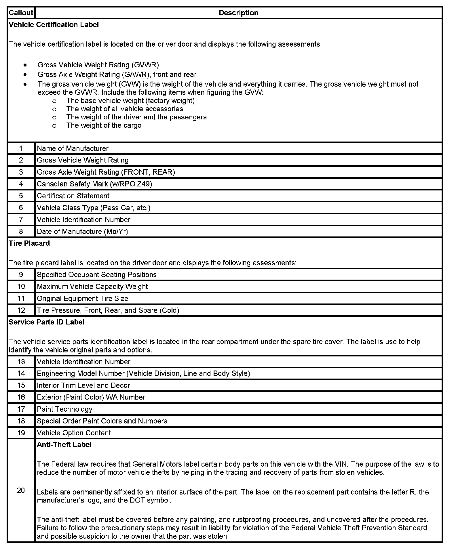 Vehicle Certification, Tire Placard, Anti-Theft, and Service Parts ID Label