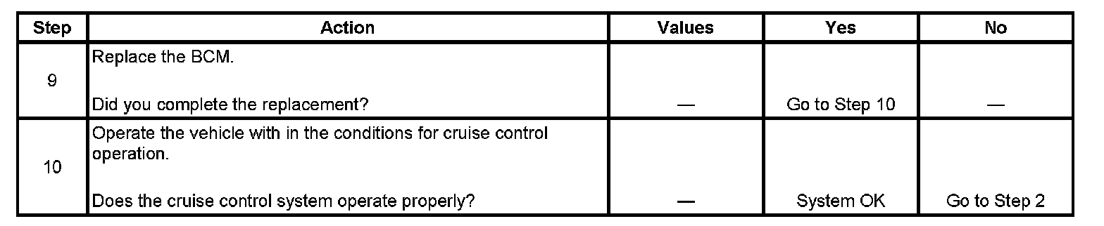 The following are the correct switch resistance value ranges and the correct counts that are displayed in the Cruise parameter in the Body and Accessories / Cruise Control / IPM / Inputs data list, when each switch is pressed individually. If no switch is pressed the resistance value should be infinite.