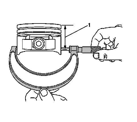 1. Using an outside micrometer, measure the width of the piston at 30 mm (1.181 inch) below the crown, top (1), at the thrust surfaces of the piston, perpendicular to the piston pin centerline.