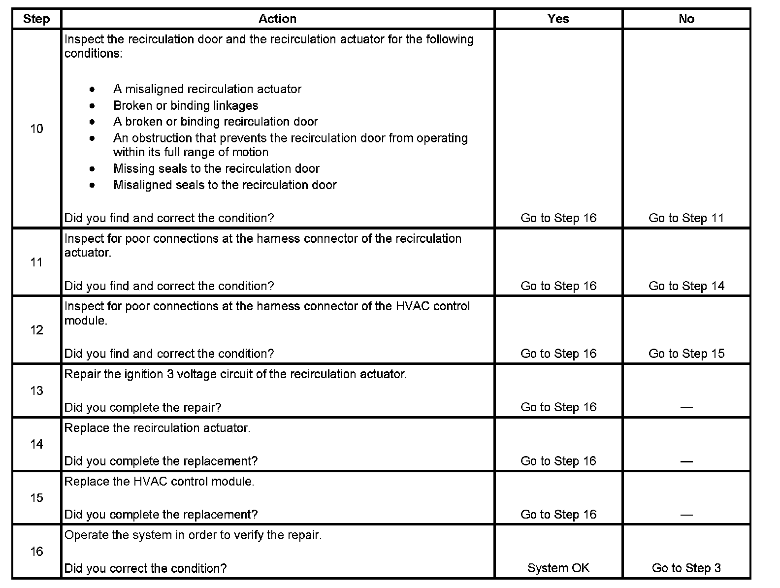 - The recirculation actuator will operate properly when outside air is requested.