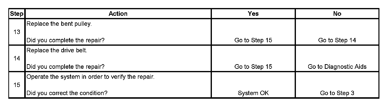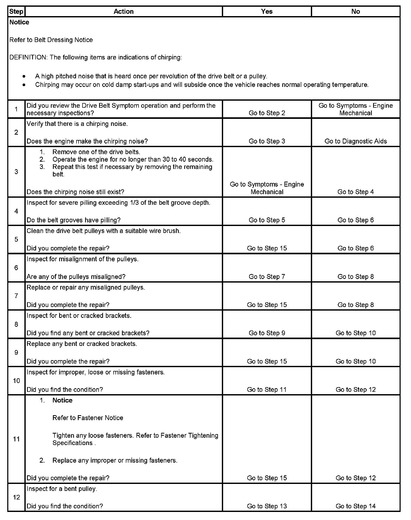 3. The noise may be an internal engine noise. Removing the drive belts one at a time and operating the engine for a brief period will verify the noise is related to the drive belt. When removing the drive belt the water pump may not be operating and the engine may overheat. Also DTC's may set when the engine is operating with the drive belts removed.