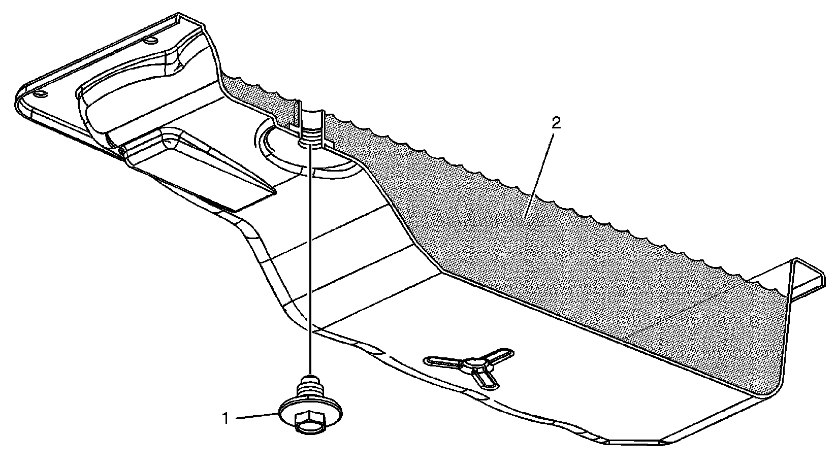 6. Remove the trans oil level check plug (1) from the transmission fluid pan. Allow any fluid (2) to drain.