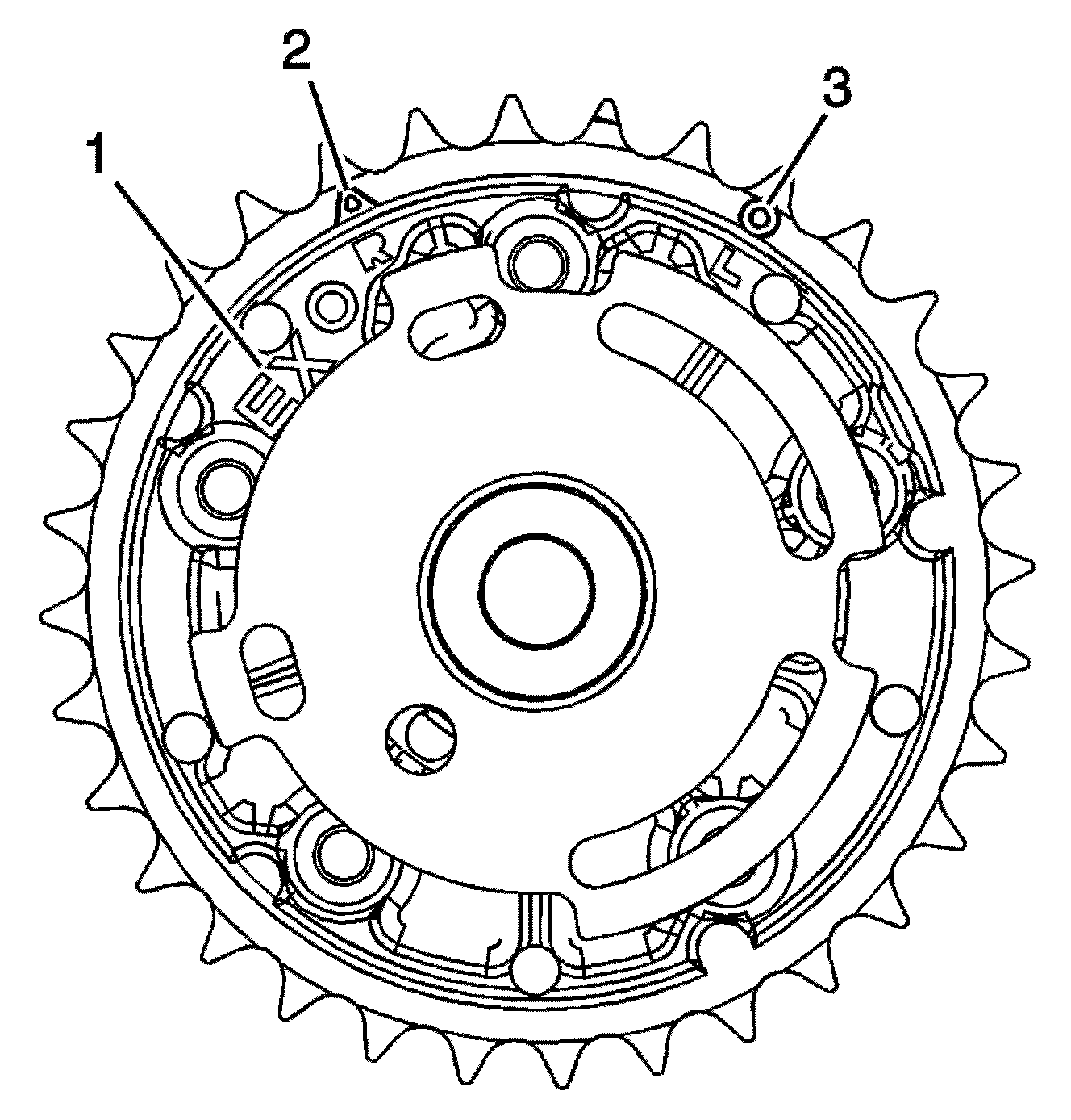 1. Ensure the proper camshaft position actuator is installed. Observe the body of the camshaft position actuator for the EX marking (1). The marking is for the exhaust camshaft position actuator.