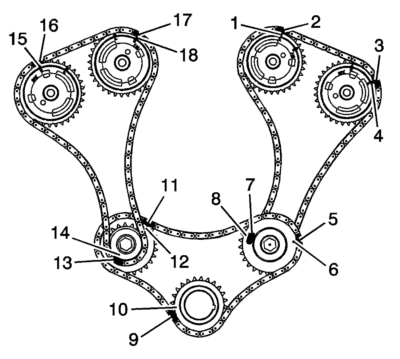 8. Mark the timing chain and the respective locations on camshaft position actuators (15-18).