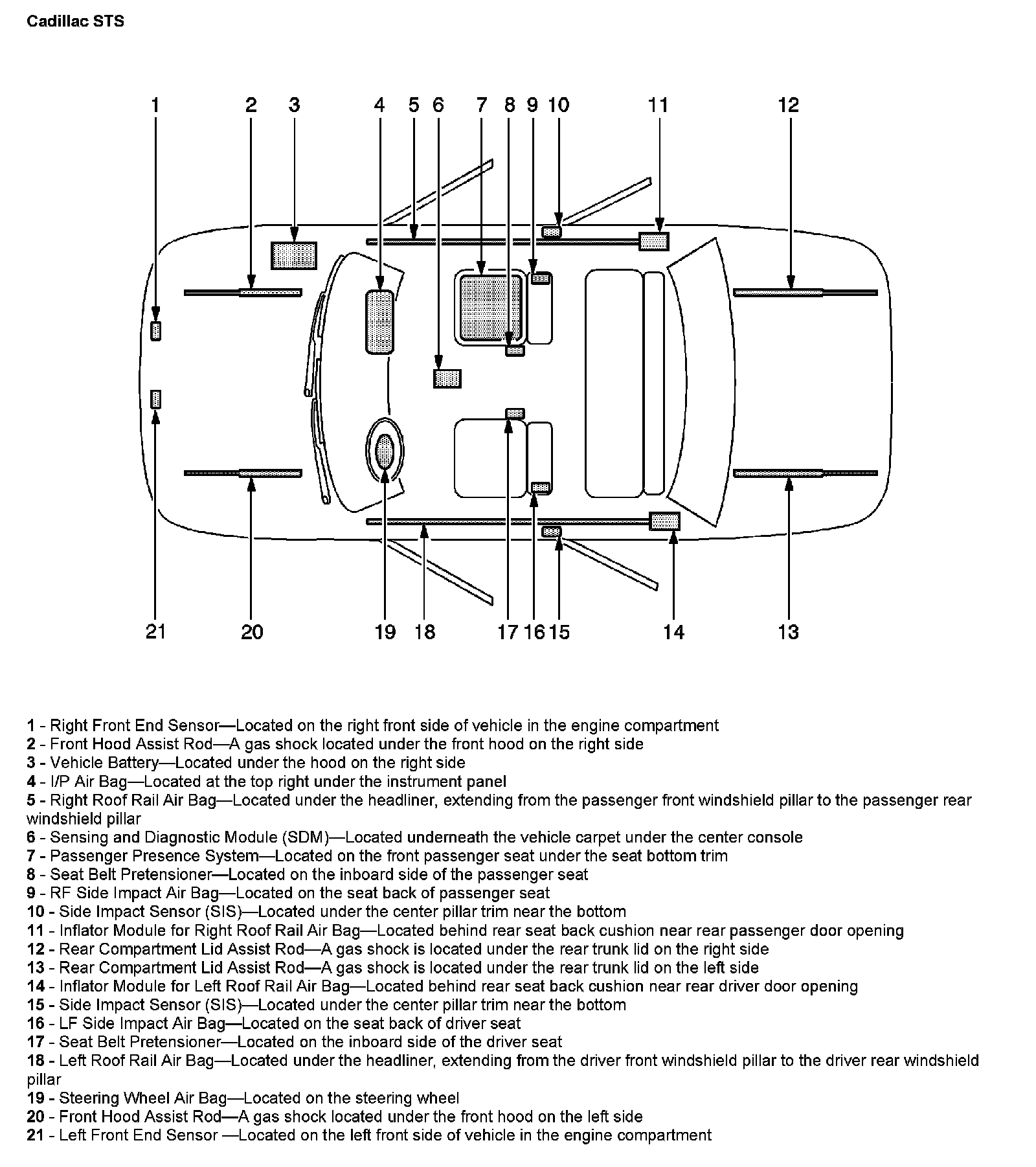 The SIR Identification Views shown illustrate the approximate location of all SIR components available for the vehicle. This will assist in determining the appropriate SIR Disabling and Enabling for a given service procedure. Refer to SIR Disabling and Enabling.