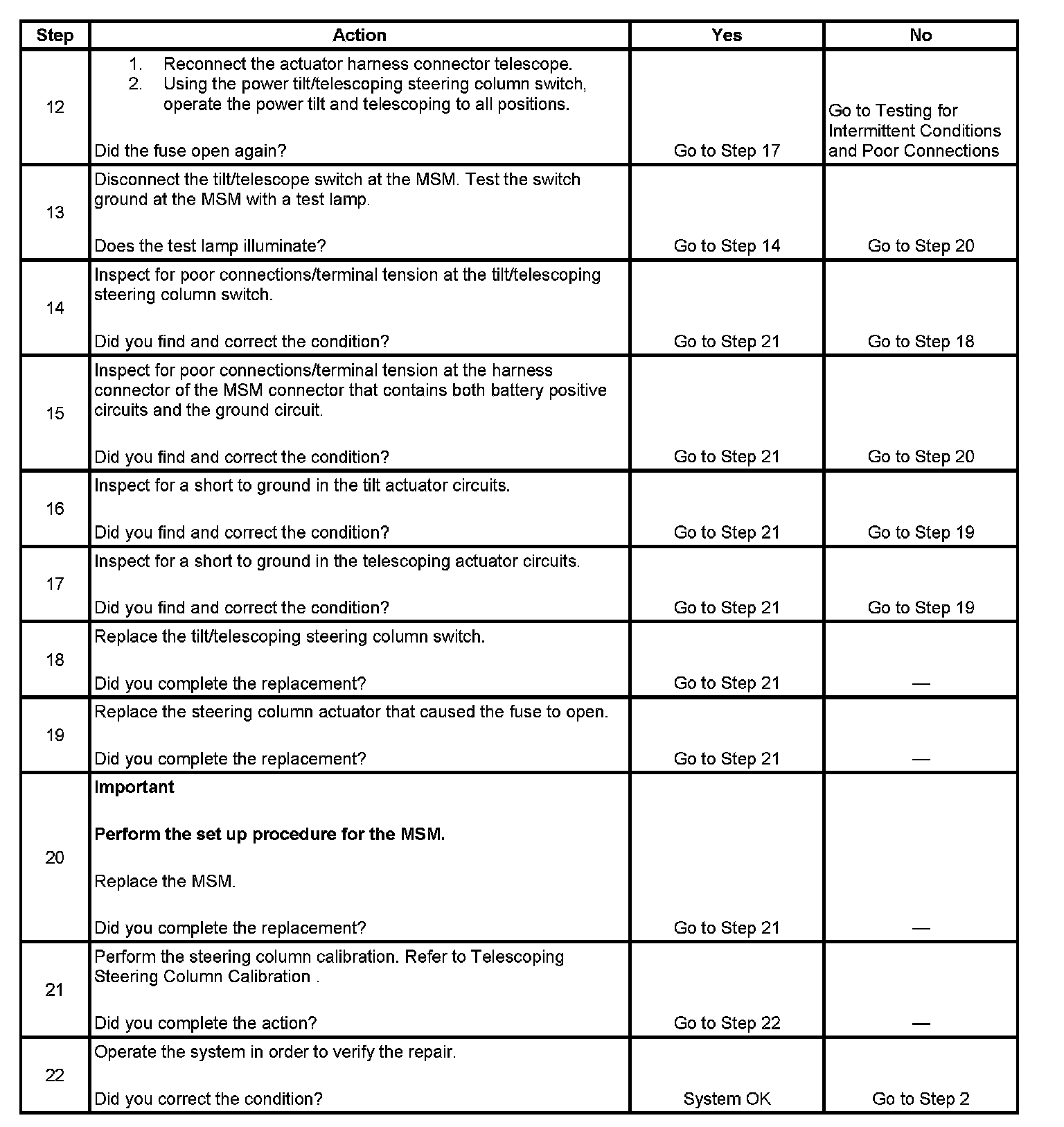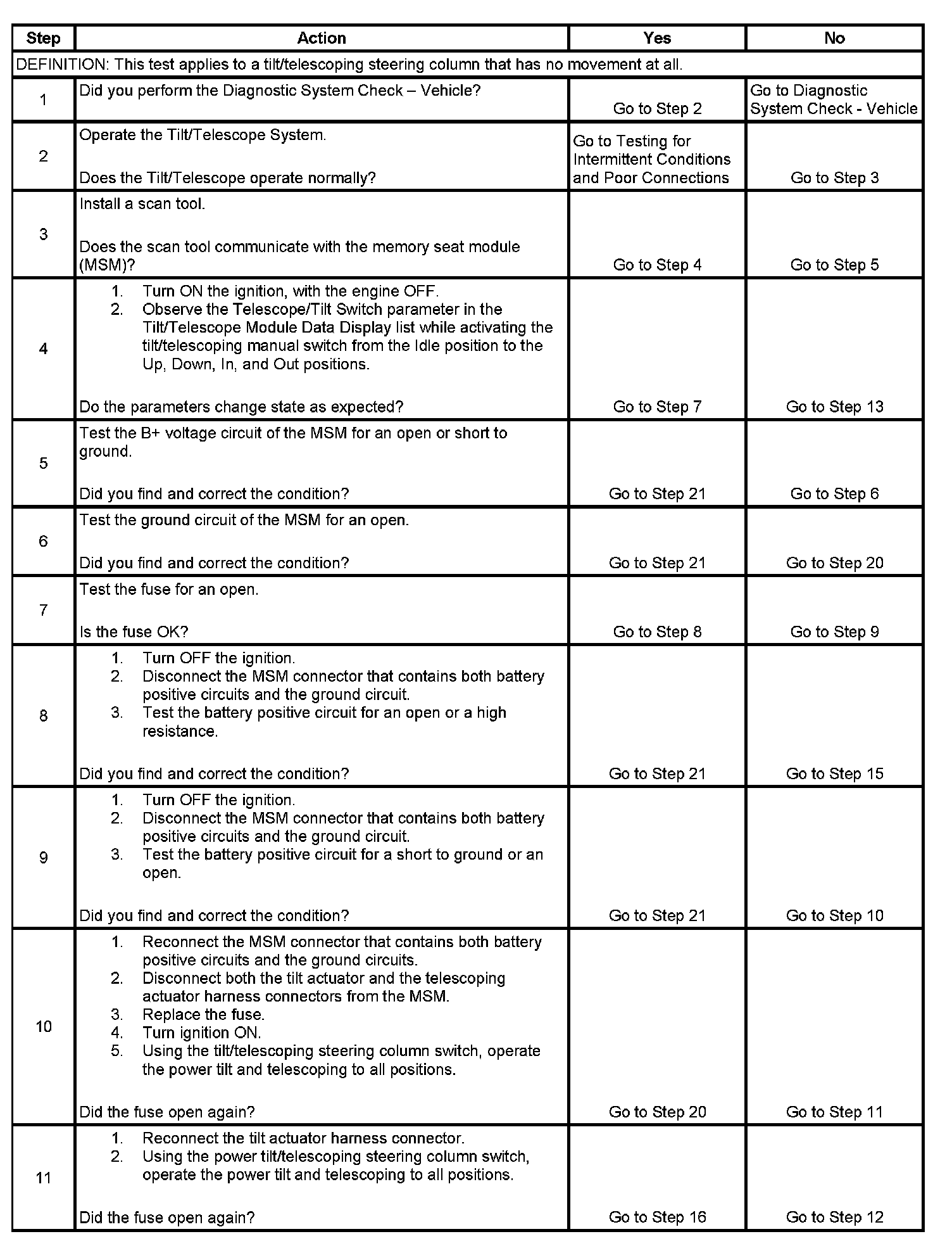 8. If either the tilt actuator or the telescope actuator displays Motor Current on the scan tool Data Display, as less than 0 amps and/or more than 10 amps in this step, go to the applicable chart for that actuator being inoperative.