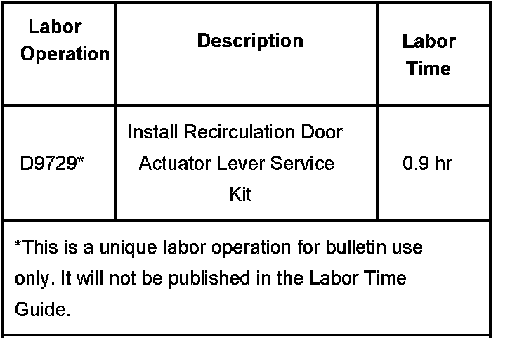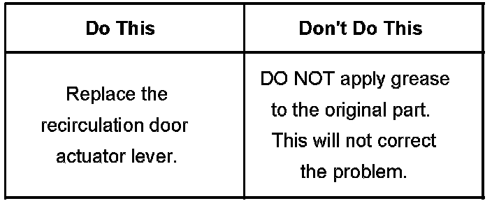 Technicians are to install a recirculation door actuator lever service kit. Refer to the instructions included with the service kit and the Air Inlet Assembly Replacement and the Recirculation Actuator Replacement procedures in SI.