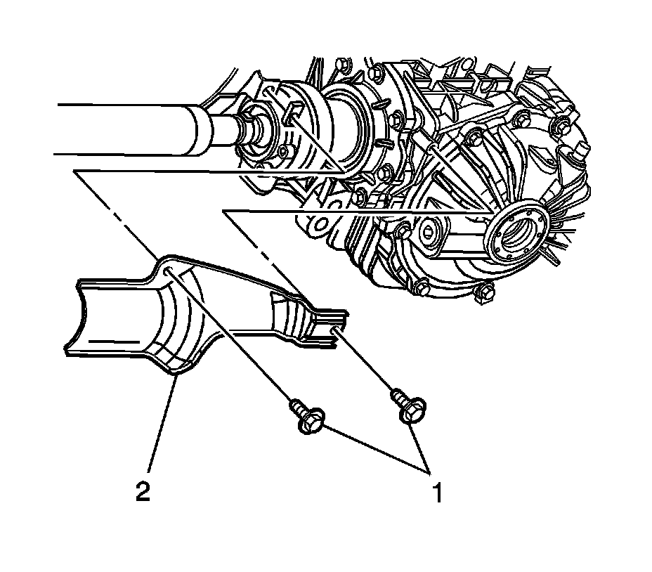 3. Remove the front propeller shaft CV joint heat shield (2).