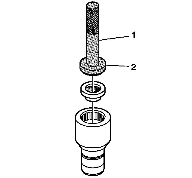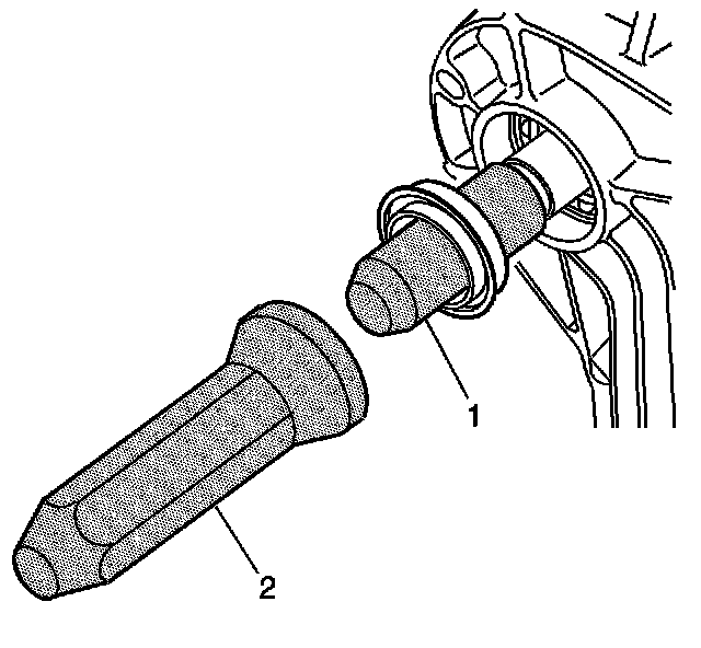3. Using the J 8092 (1) and the J 45239 (2), install the control actuator lever shaft bearing until it bottoms in the bore. The seal side of the bearing faces the encoder motor.