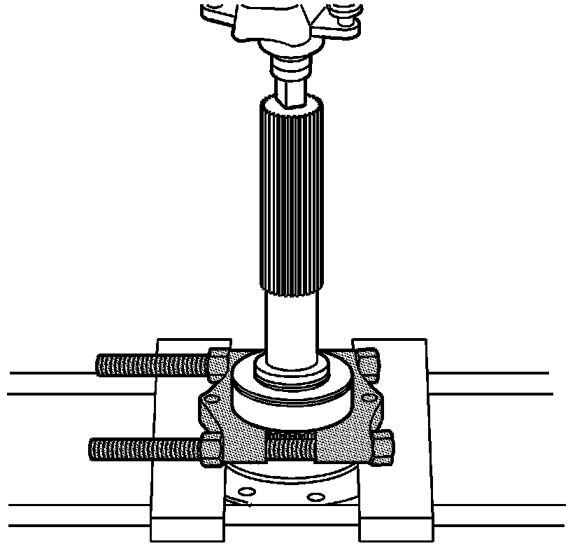 ^ Using a wrench on the forcing screw, remove the rear output shaft bushing.