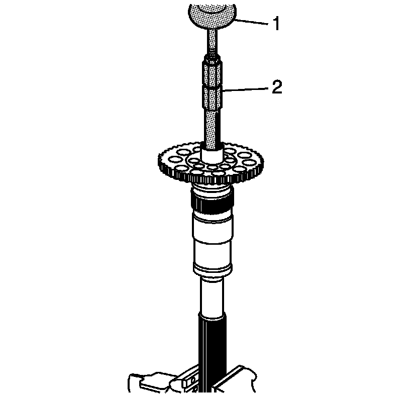 37. Using the J 2619-01 (1) and the J 45548 (2), remove the mainshaft rear bushing.