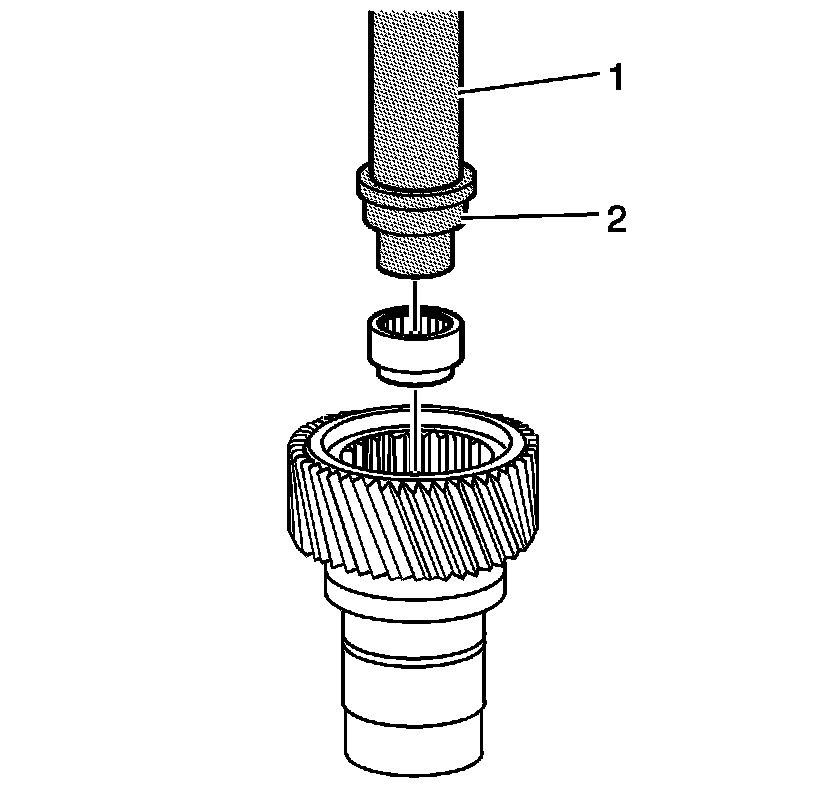 18. Install the needle bearing in the input gear, using the J 8092 (1) and the J 45383 (2). Use the large diameter of the tool to install the bearing.