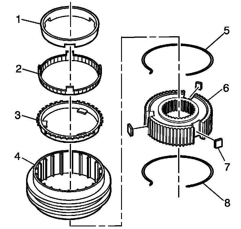3. Install the synchronizer sleeve (4) on the synchronizer hub (6). The sleeve with the taper and groove end aligns to the shorter side teeth of the hub.