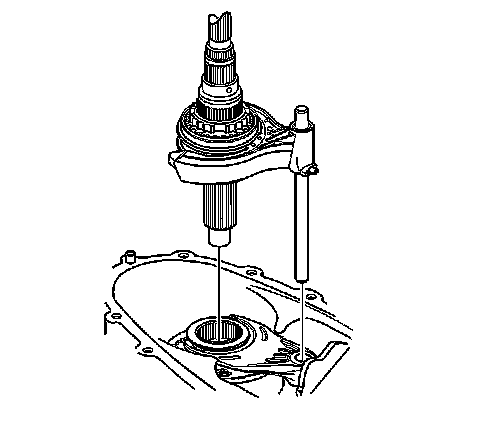 Install the shift shaft and the synchronizer assembly with the rear output shaft in the front case half and the high/low range sleeve.