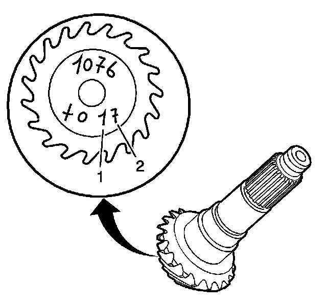 18. Determine if the drivenshaft has a plus, minus, or zero value etched onto the end of the gear. Note that the handwritten 1 (1) and 7 (2) are similar. The 7 (2) will have a line drawn through the number. A comma is to be considered a decimal point.
