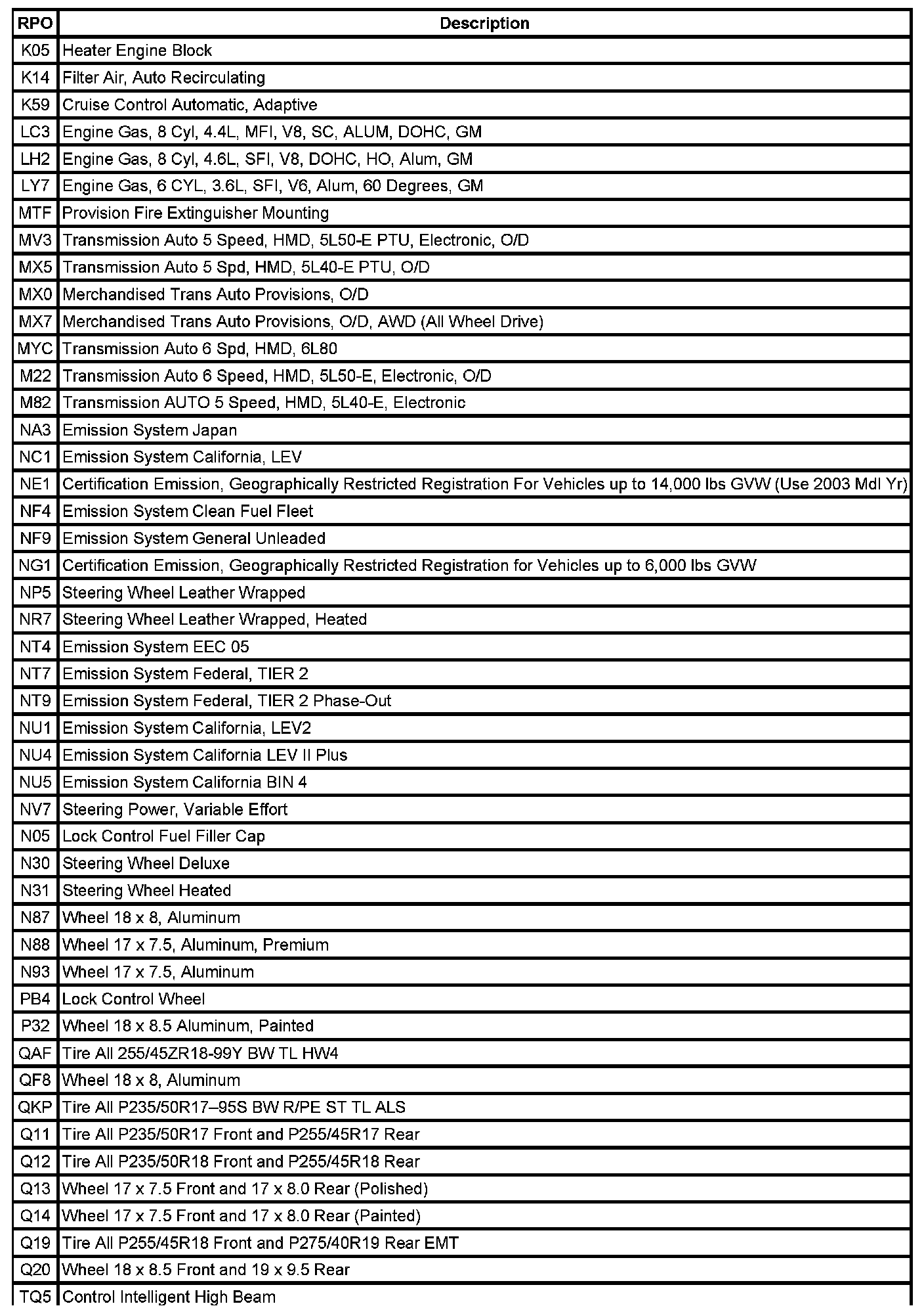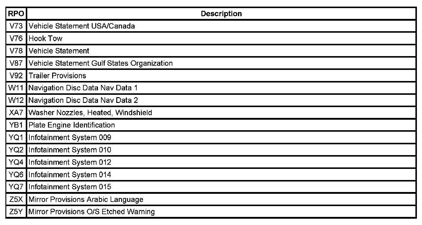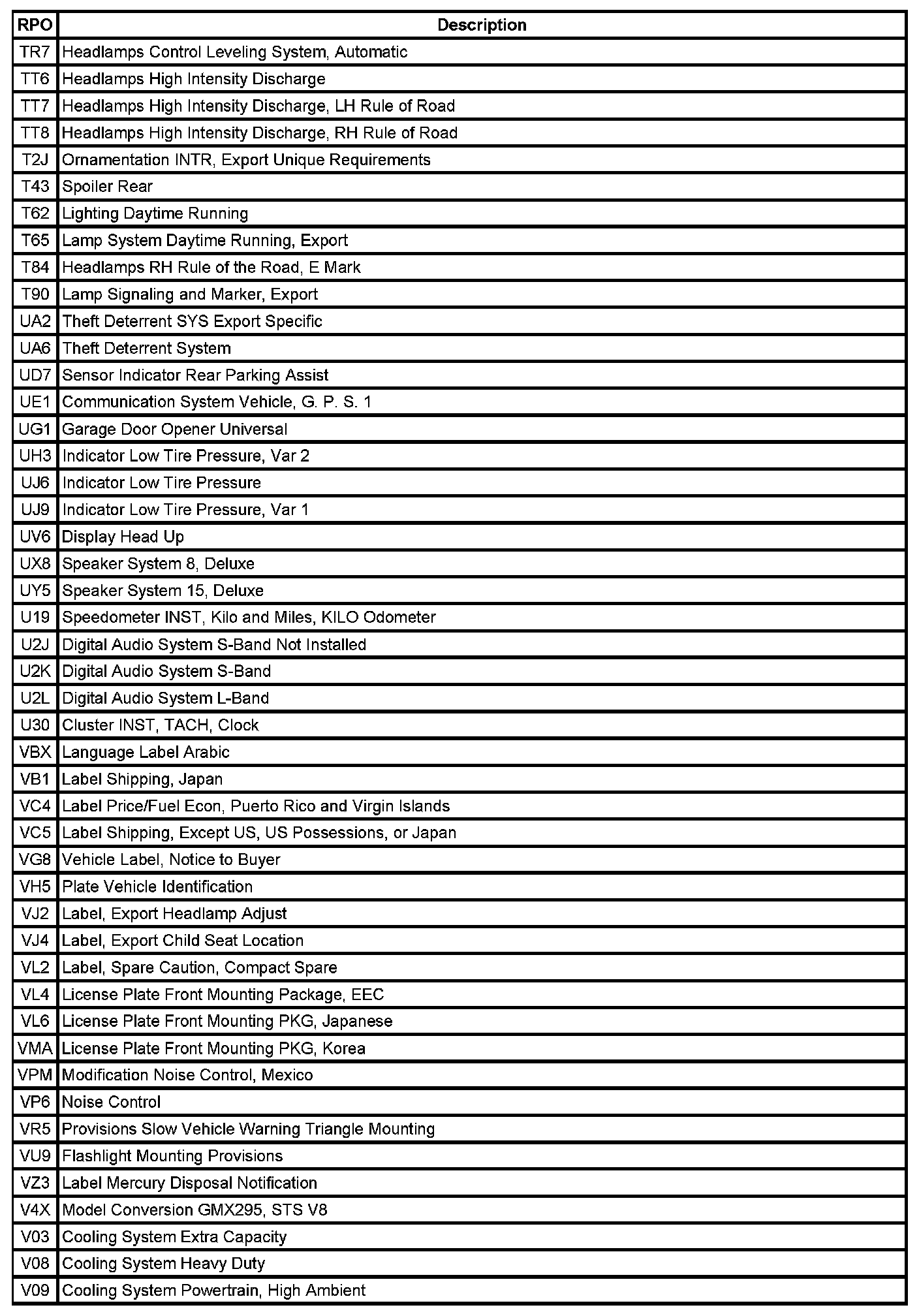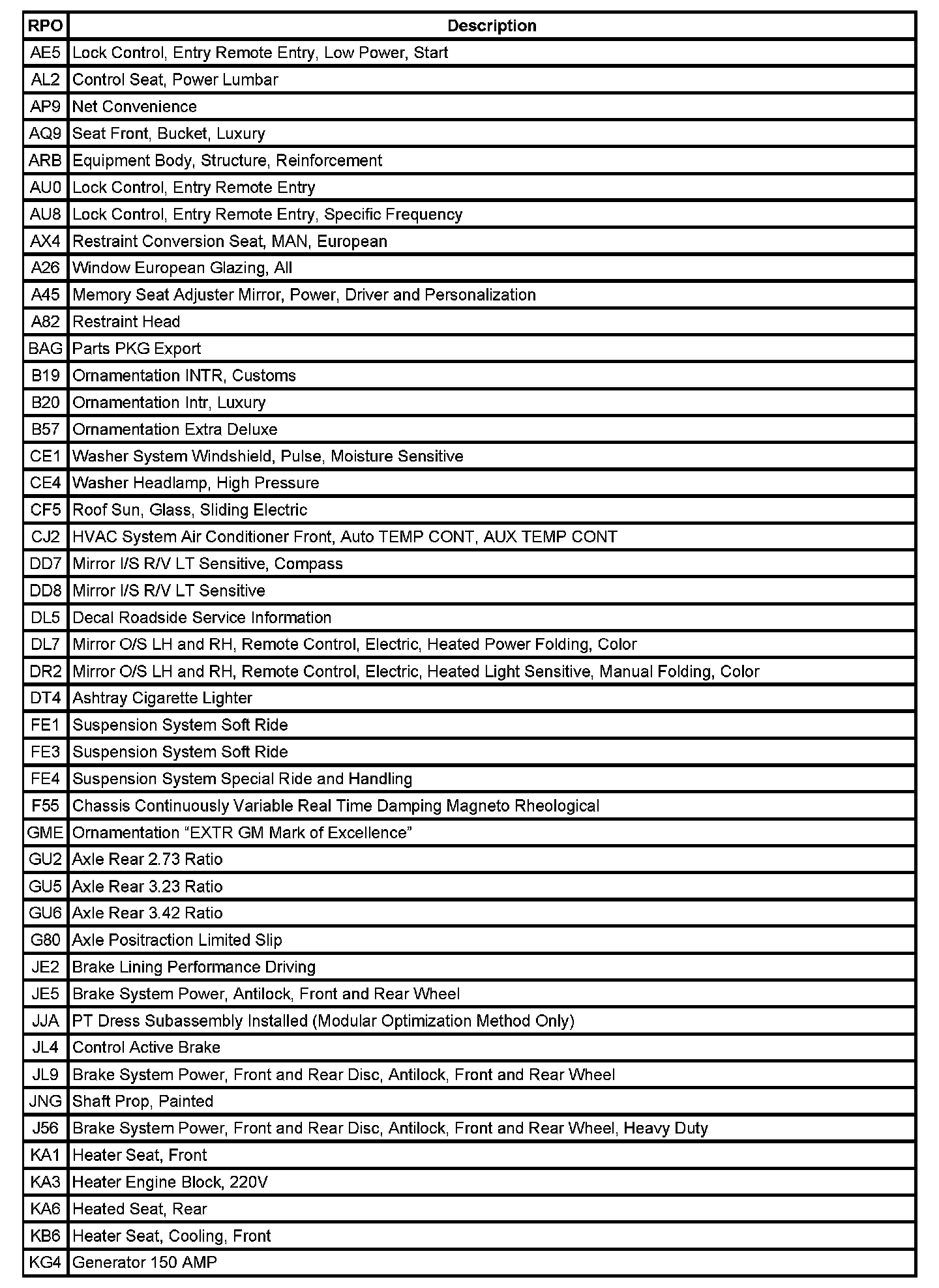The table provides the description of the Regular Production Option (RPO) codes that are available on the vehicle. The vehicle's RPO list is printed on the Service Parts Identification Label.