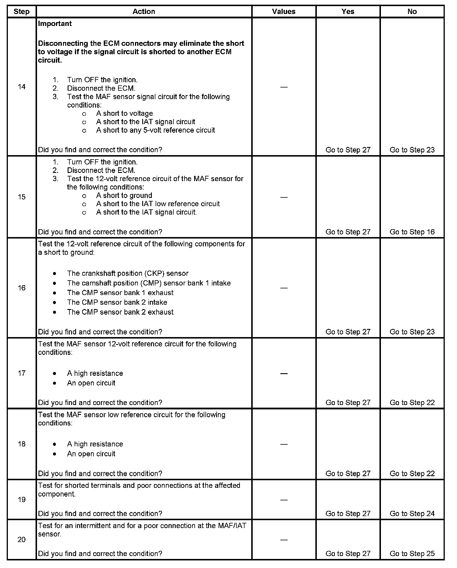 - A short between the MAF sensor 12-volt reference circuit and the IAT signal circuit will produce a stalling condition that becomes a Crank/No Start condition.