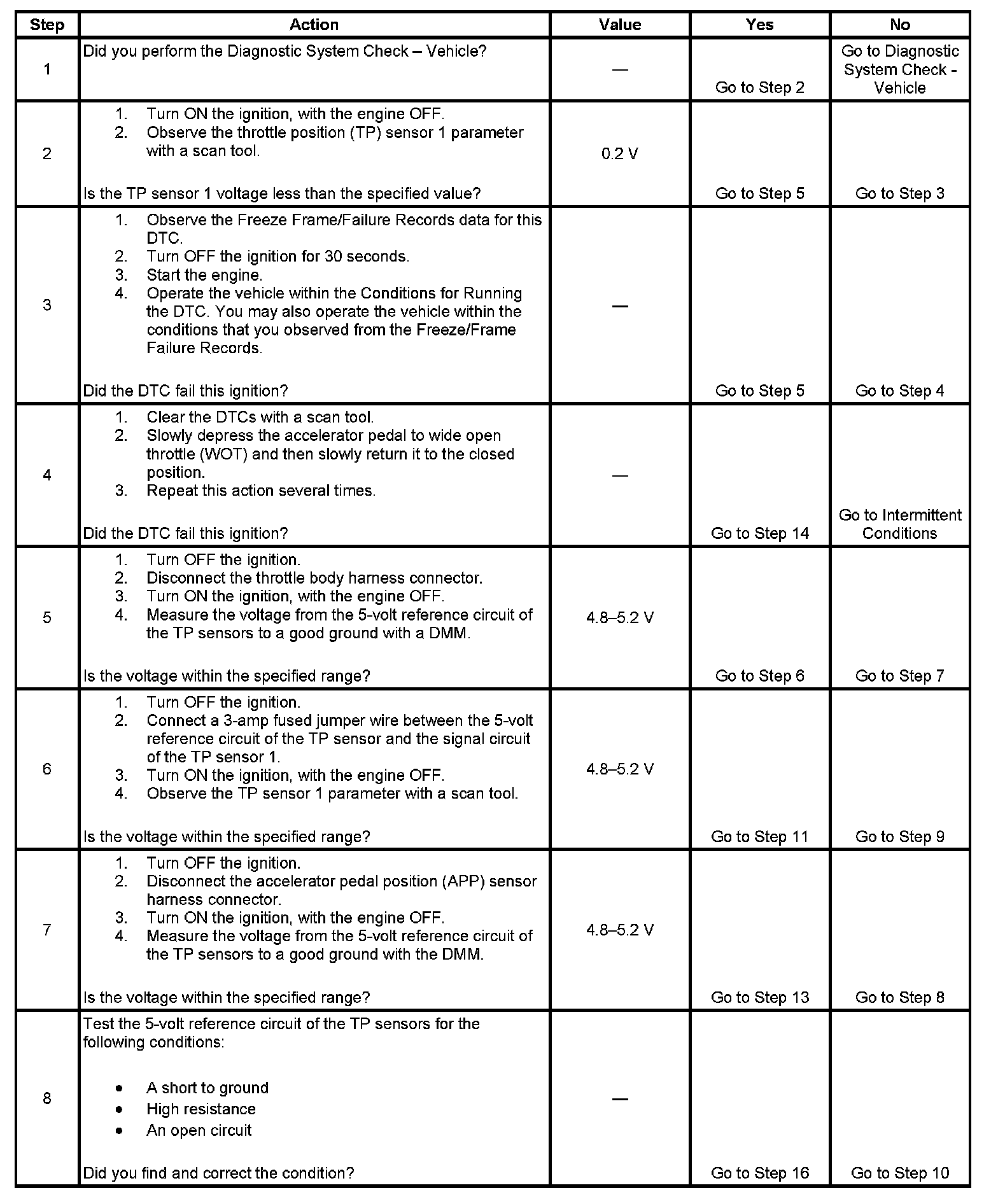 4. The ECM performs a comparison of the signals from both TP sensors during the entire range of operation. If the DTC does not set with the key ON and the accelerator pedal released, actuating the throttle may cause the DTC to set.