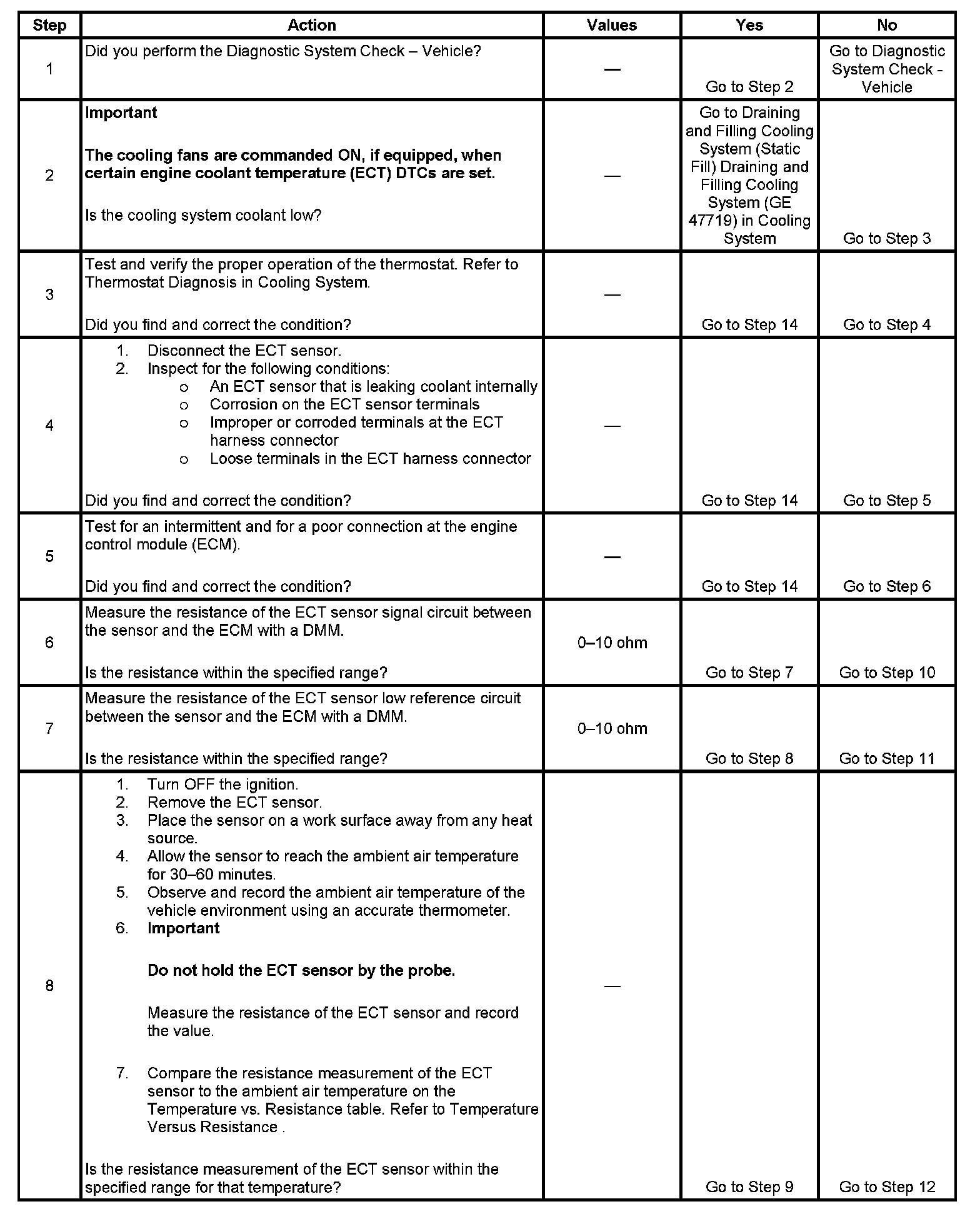 An engine coolant temperature (ECT) sensor monitors the temperature of the coolant. This input is used by the engine control module (ECM) for engine control and as an enabling criteria for other diagnostics. This input also determines if the ECT is insufficient for thermostat regulating of the coolant.