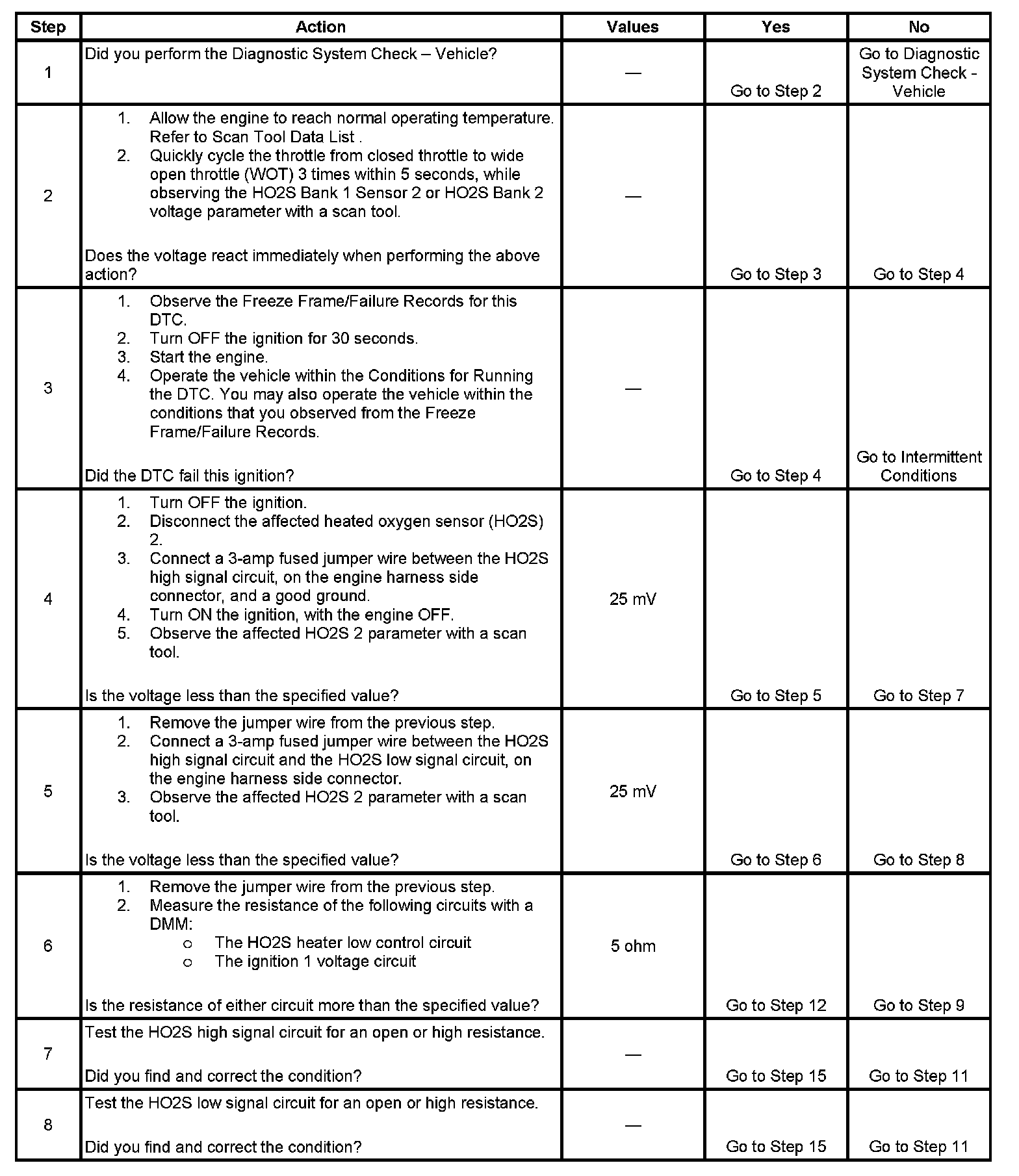 - The ECM detects that the HO2S voltage parameter has not moved outside the range of 356-522 mV for more than 5 seconds. OR