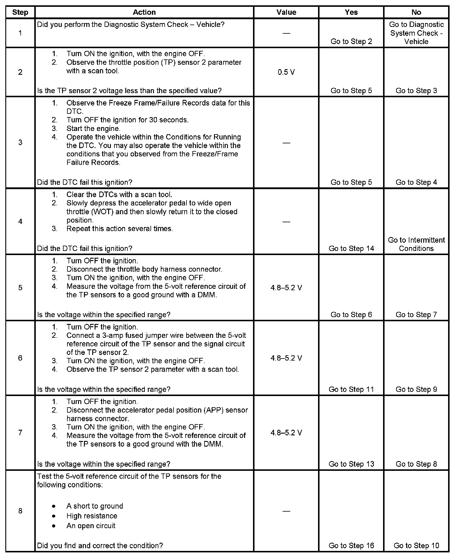 4. The ECM performs a comparison of the signals from both TP sensors during the entire range of operation. If the DTC does not set with the key ON and the accelerator pedal released, actuating the throttle may cause the DTC to set.