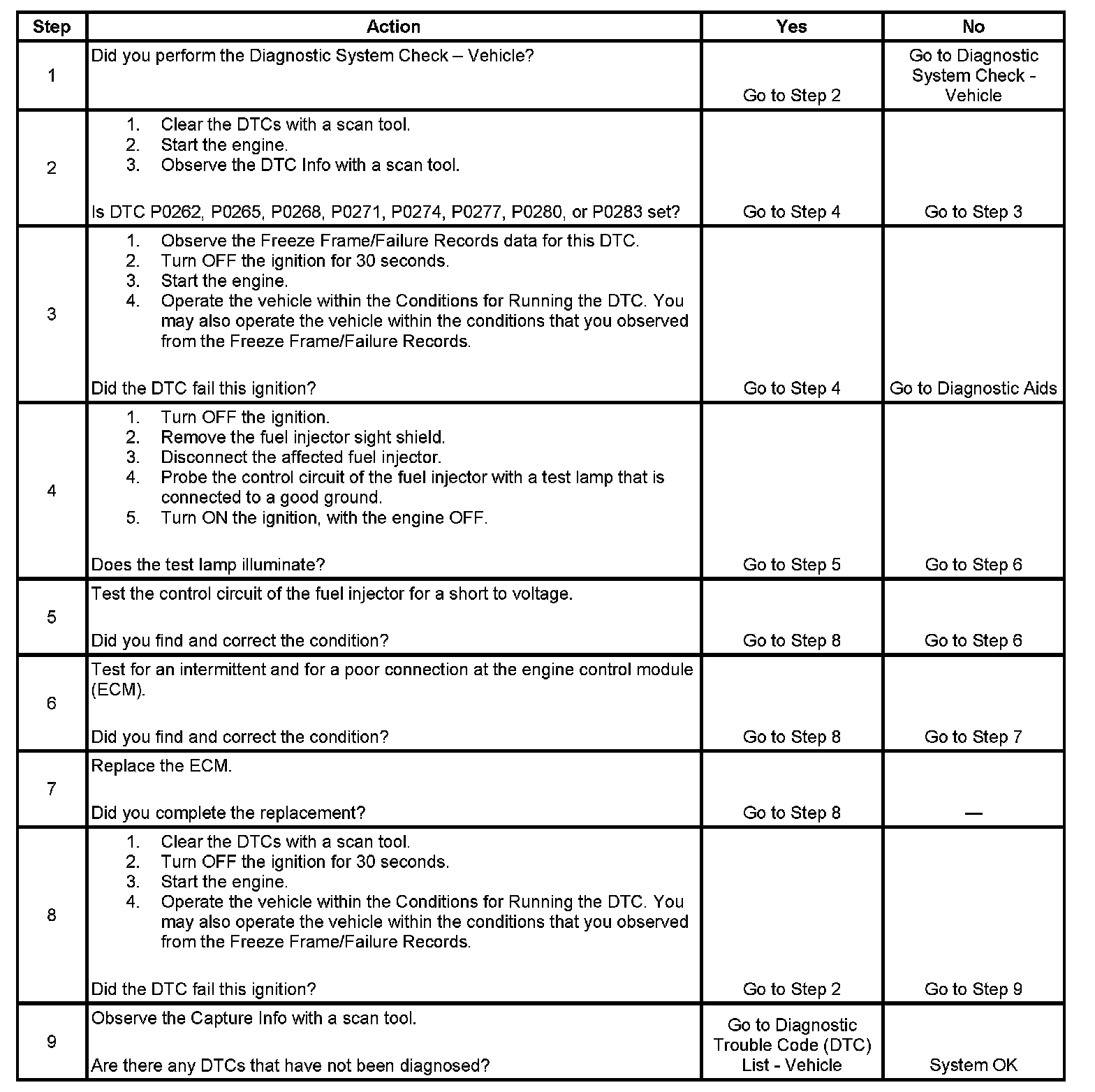 The engine control module (ECM) enables the appropriate fuel injector pulse for each cylinder. Ignition voltage is supplied to the fuel injectors. The ECM controls each fuel injector by grounding the control circuit via a solid state device called a driver. The ECM monitors the status of each driver. If the ECM detects a high voltage for the commanded state of the driver, DTC P0262, P0265, P0268, P0271, P0274, P0277, P0280, P0283 sets.