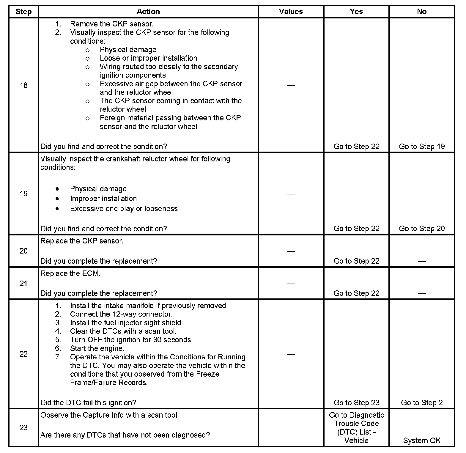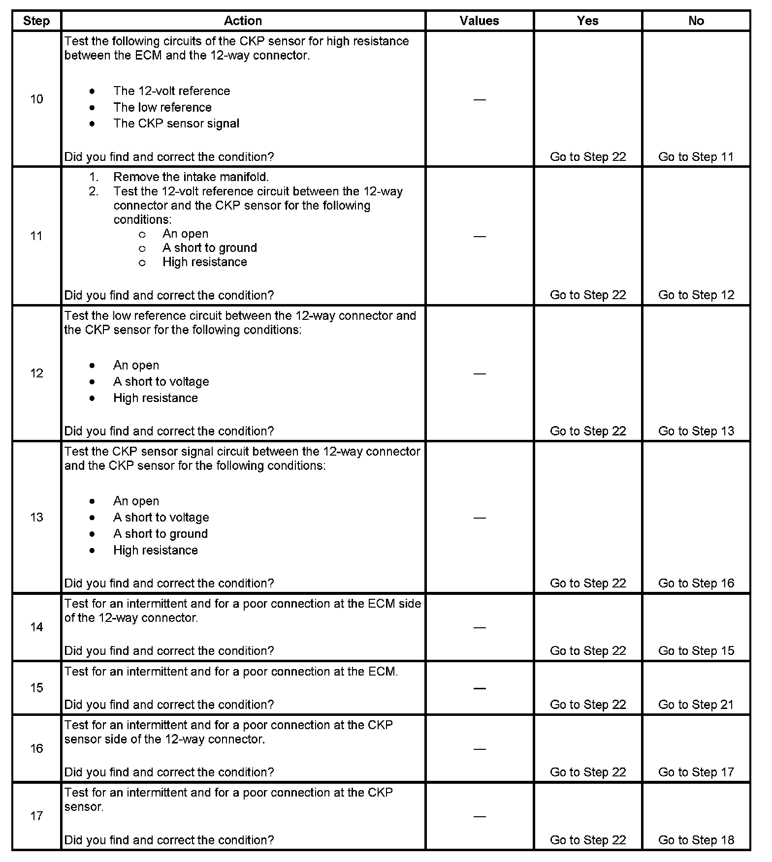 The crankshaft position (CKP) sensor signal indicates the crankshaft speed and position. The CKP sensor produces a DC voltage of varying amplitude and frequency. The frequency depends on the velocity of the crankshaft, and the DC output voltage depends on crankshaft position and battery voltage. The CKP sensor works in conjunction with a 58-tooth reluctor wheel attached to the crankshaft. The engine control module (ECM) determines the crankshaft position by the reference gap. The ECM can synchronize the ignition timing, fuel injector timing, and the spark knock control based on the CKP sensor and the camshaft position (CMP) sensor inputs. The CKP sensor is also used to detect a misfire. The CKP sensor circuits connect directly to the ECM. The circuits between the CKP sensor and the ECM consists of the following:
