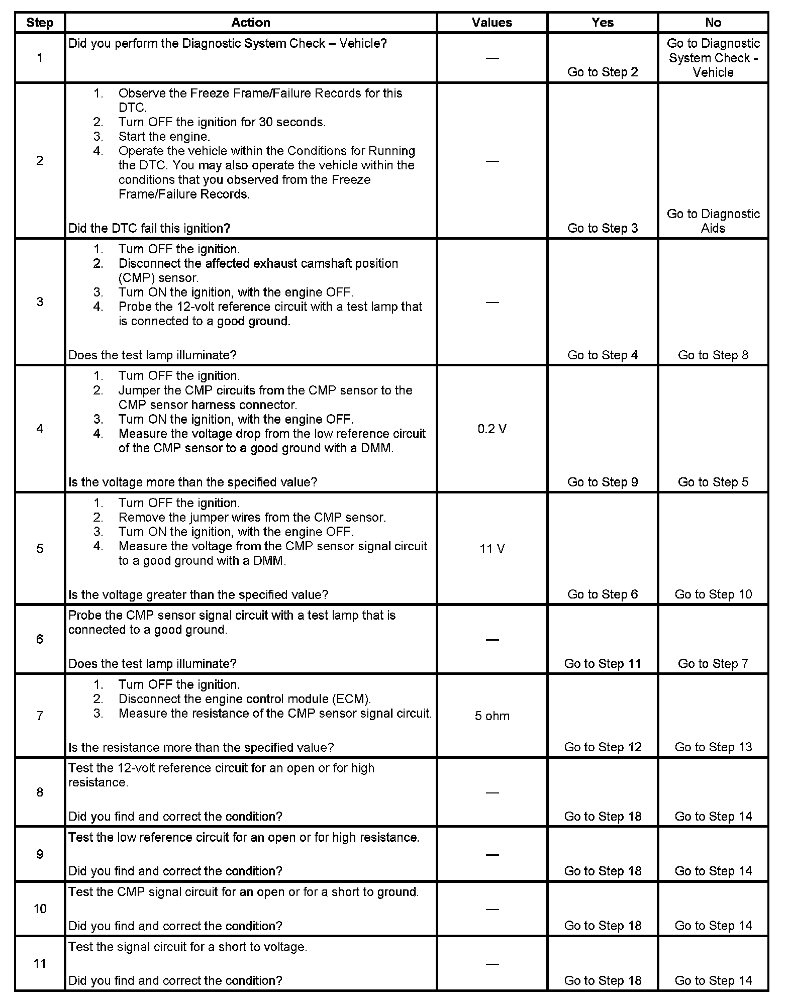 The exhaust camshaft position (CMP) sensor is a hall integrated circuit (IC) type sensor that works in conjunction with a single tooth reluctor wheel used to determine the position of the exhaust camshaft. The engine control module (ECM) supplies a 12-volt pull up voltage on the CMP sensor signal circuit. As the tooth on the reluctor wheel passes the CMP sensor, it sends a digital signal which is an image of the reluctor wheel to the ECM. The ECM processes this information to determine the exact position of the camshafts, and to determine the optimum ignition and injection points of the engine. The CMP sensor wiring consists of a 12-volt reference circuit, a low reference circuit, and a signal circuit. If the ECM cannot see a change in the exhaust CMP sensor signal, DTC P0365 or P0390 will set.