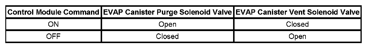 The table illustrates the relationship between the ON and OFF states, and the Open or Closed states of the EVAP canister purge and vent solenoid valves.